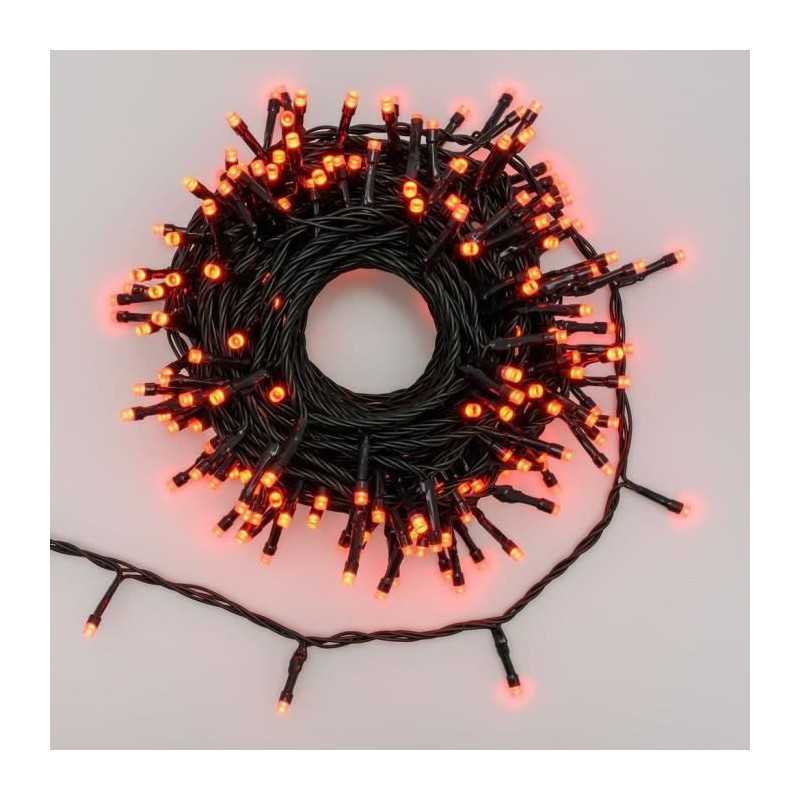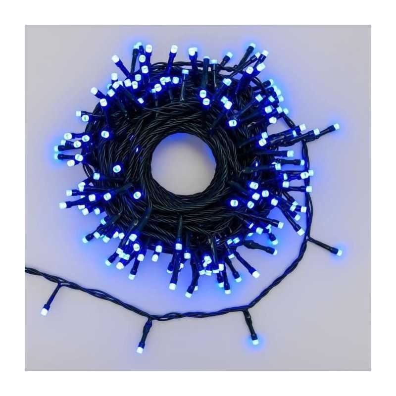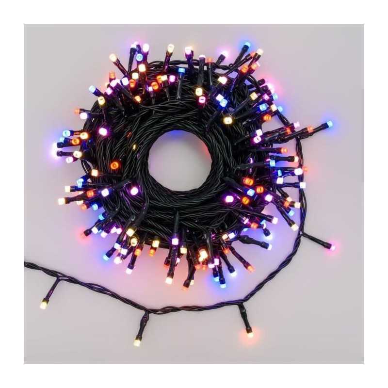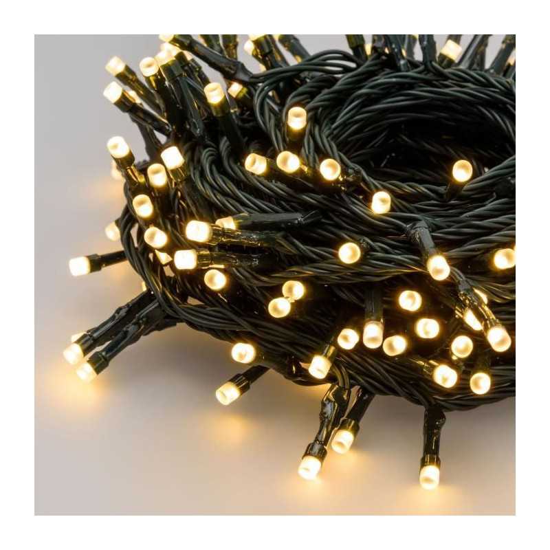 Guirlande lumineuse WONDER 16m 200 LED SuperBright Ø5mm, 8 couleurs x 6 jeux de lumiere (48 effets lumineux inclus Blanc Chaud et Lumiere Fixe) sélec par le biais d'un Contrôleur 2 Touches Steady/Functions ou Télécommande RF 13 Touches, Timer On-Off 6-18 heures désactivable, Prolongeable avec Cod. 63761 (Max 600 led / 48m), Transf a Basse Tension de Sécurité, IP44 utilis en Extérieur et Intérieur, Câble Vert, Câble d