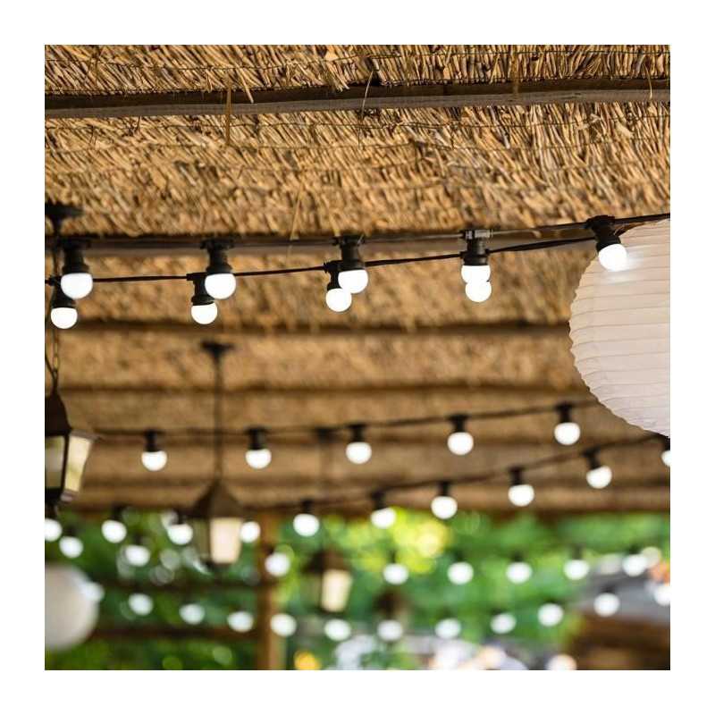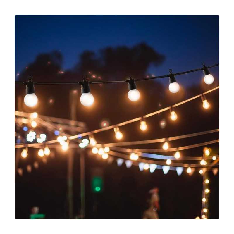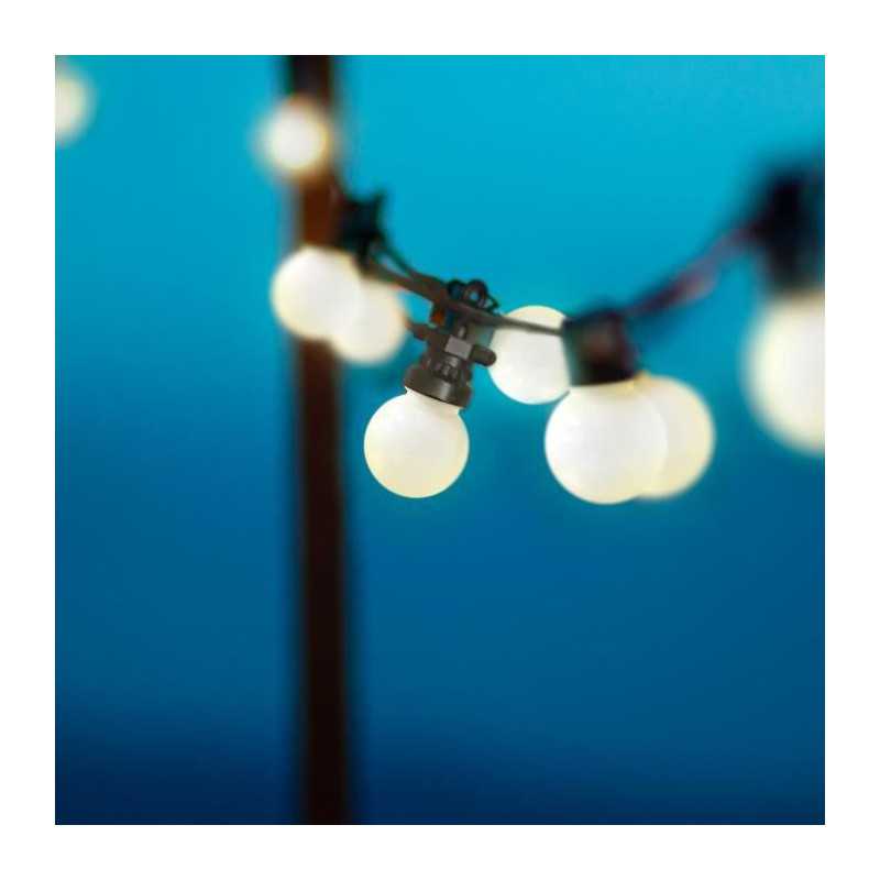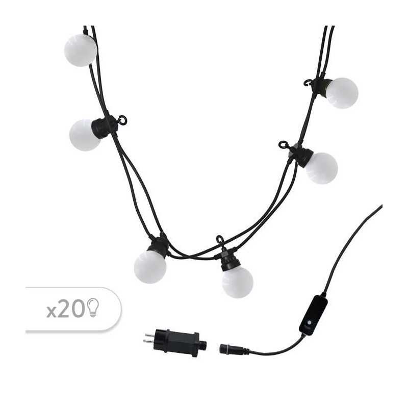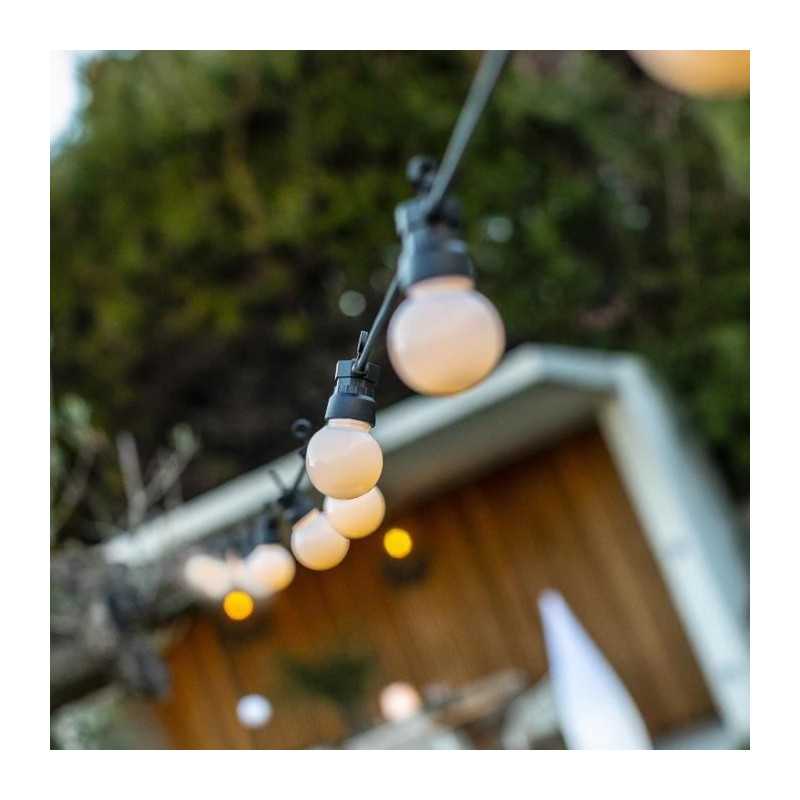 Guirlande lumineuse connectable 20 globes guinguettes LED blanc chaud PARTY MILKY 9,6m 8 modes - Cette guirlande se distingue par son design simple et tendance - Les ampoules sont fixées sur la guirlande mais des petits crochets au-dessus des ampoules permettent de les suspendre - 60 Lumens - IP44 - Résiste aussi aux UV.