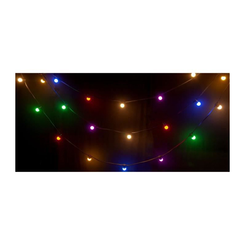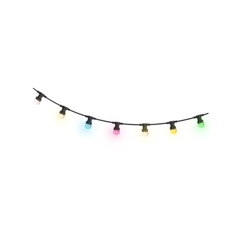 Guirlande lumineuse style guinguette avec 20 LEDs de couleur d'une longueur de 10m - Avec une protection IP44, votre guirlande est conçue pour une utilisation extérieure - Rendez vos moments magiques ! Spécificités : 50 cm entre chaque ampoule, entrée et sortie électrique permettant d'enchaîner plusieurs guirlandes