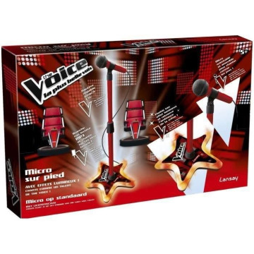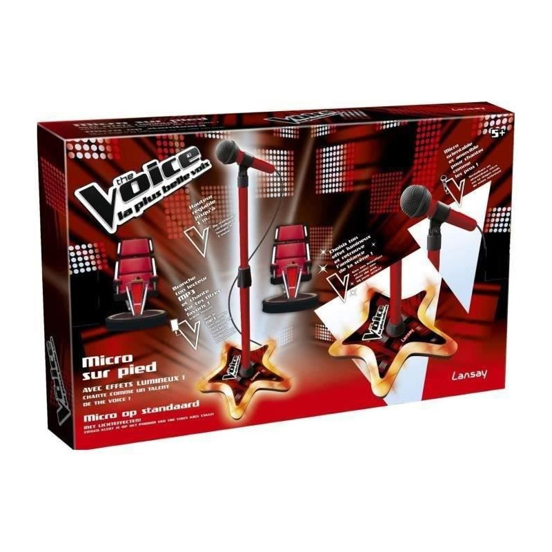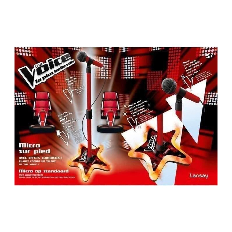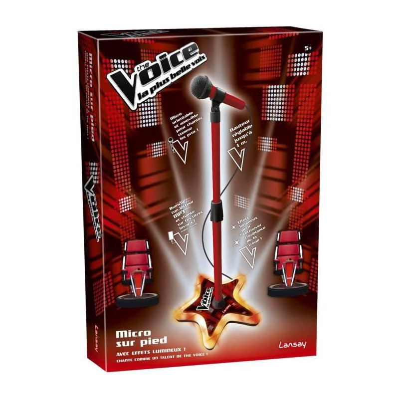 Entraîne-toi a chanter avec le micro sur pied The Voice ! Le micro est orientable et le pied est réglable jusqu'a 1m de hauteur. Mets-toi dans l'ambiance d'un véritable concert grâce a la prise d'entrée auxiliaire et branche le micro sur ton lecteur MP3 ! Fonctionne avec 3 piles LR6 non fournies. Des 5 ans