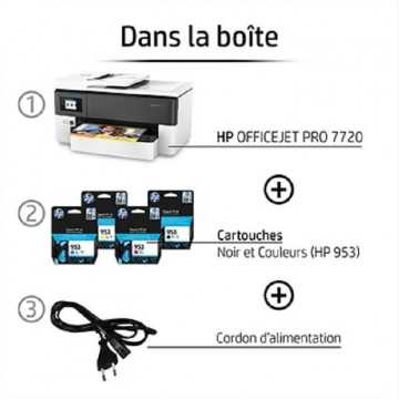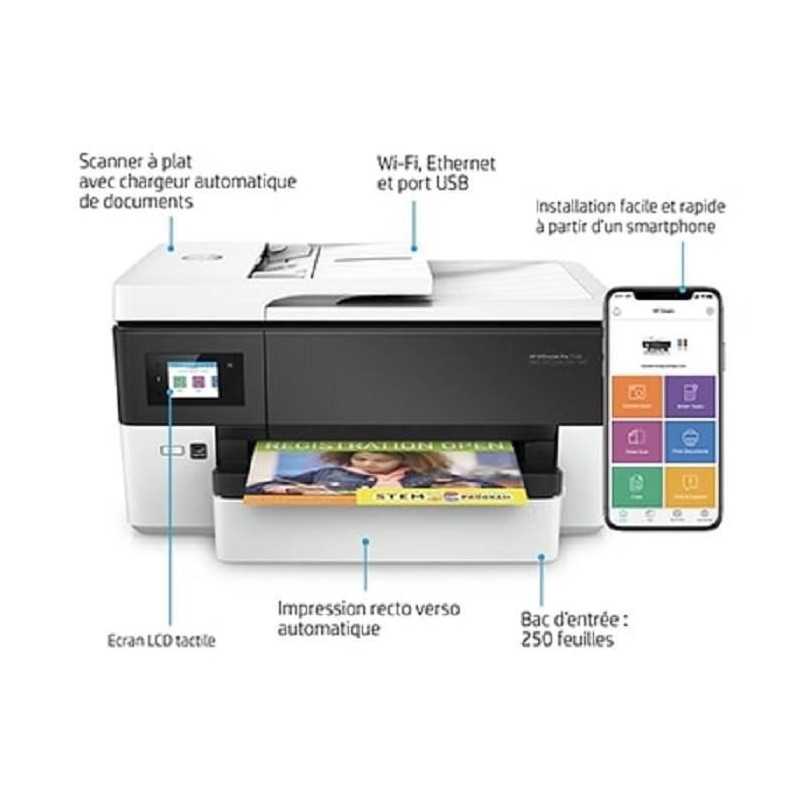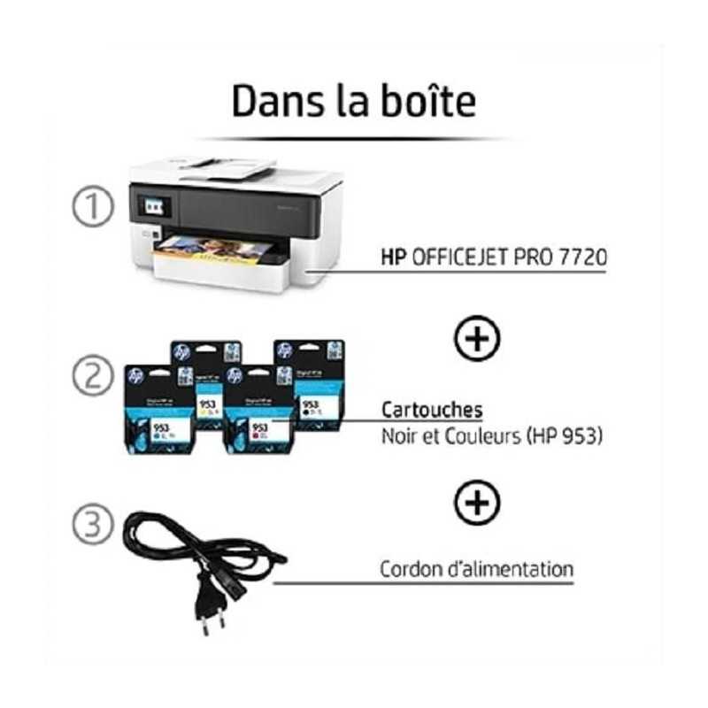 HP imprimante Tout en un- OfficeJet Pro 7720 - Format A3 - Vitesse d'impression ISO noir (A4) : jusqu'a 22 ppm Vitesse d'impression ISO couleur (A4) : jusqu'a 18 ppm Impression recto verso, Jusqu'a 3 000 pages de rendement d'encre noire , Écran tactile LCD couleur de 6,75 cm, Wi-Fi 802.11 b/g/n intégré