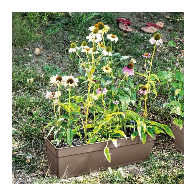 DEROMA Jardiniere avec reserve d'eau Ninfea R Camel - 60 cm H17,4 cm - Contenance : 13 litres - Avec bouchon amovible - Coloris : Taupe - Matiere Recyclat 100% recycl et 100% recyclable / Injecté - Résistant au gel et aux UV - Usage intérieur et extérieu
