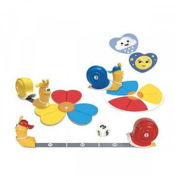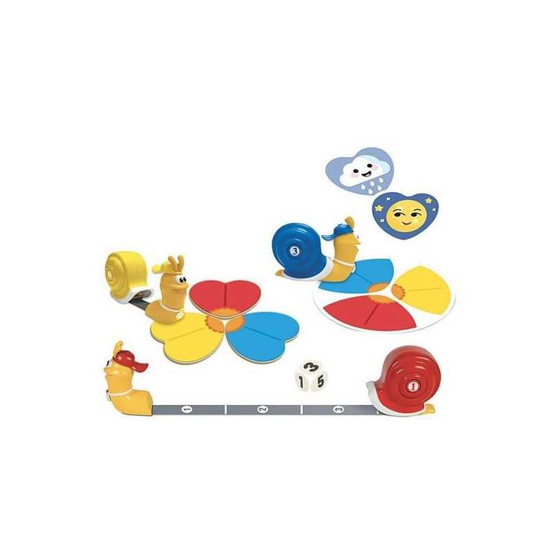 Chaque escargot contient un metre enrouleur dans sa coquille. Chacun leur tour les enfants avancent leur escargot selon le nombre indiqué sur le dé. 3 modes de jeux.