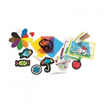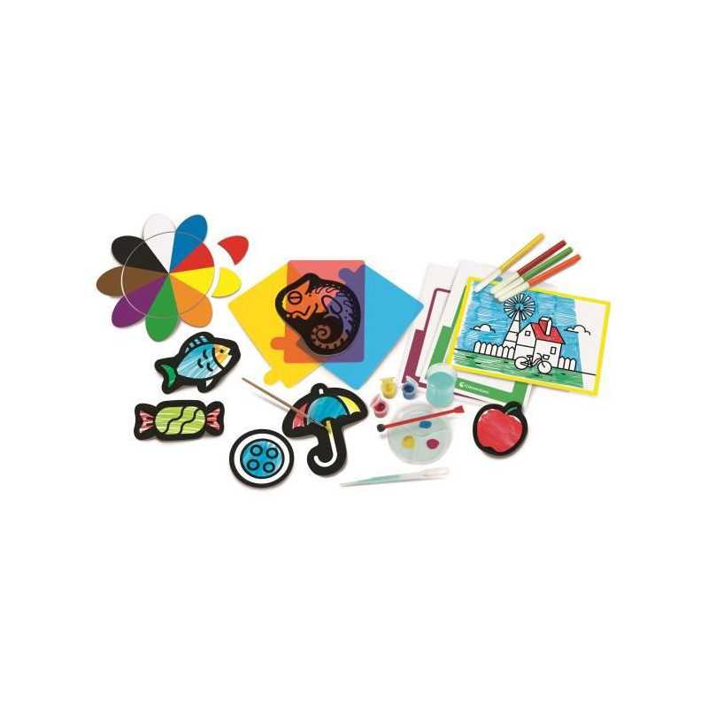Transparents colorées a superposer, peinture, pinceau, feutres et feuilles de coloriage sont les outils de ce riche coffret pour découvrir les couleurs par l'expérimentation pratique. Contient également une grande fleur en carton pour apprendre les couleurs primaires et secondaires en les mélangeant.