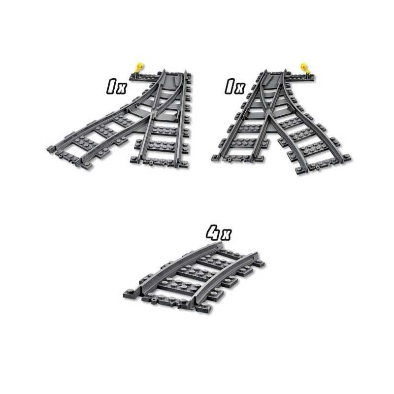 Les rails des trains LEGO® City peuvent etre rajoutés avec les pieces du set Les aiguillages LEGO® City 60238. Cet ensemble, compatible avec tous les ensembles de train LEGO® City, comprend 4 rails courbés, un aiguillage orienté vers la droite et un aiguillage orienté vers la gauche.