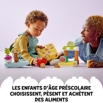Les enfants de 18 mois et plus jouent a acheter des fruits et légumes et perfectionnent leur sens de l'équilibre avec ce jouet sur le theme du marché biologique.