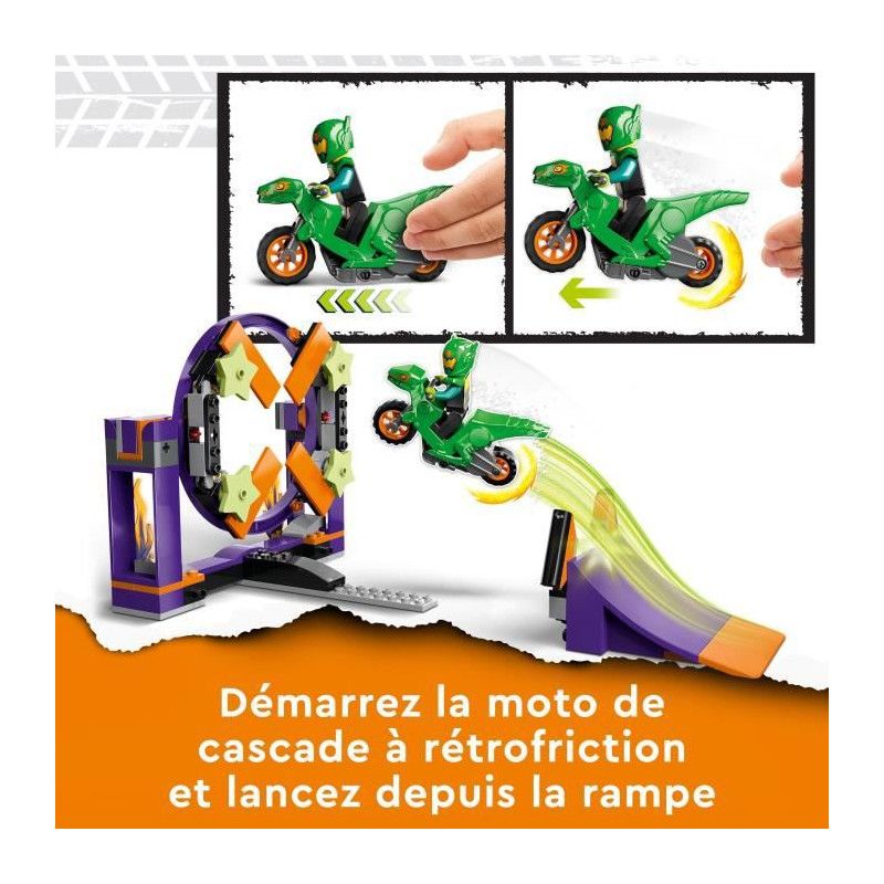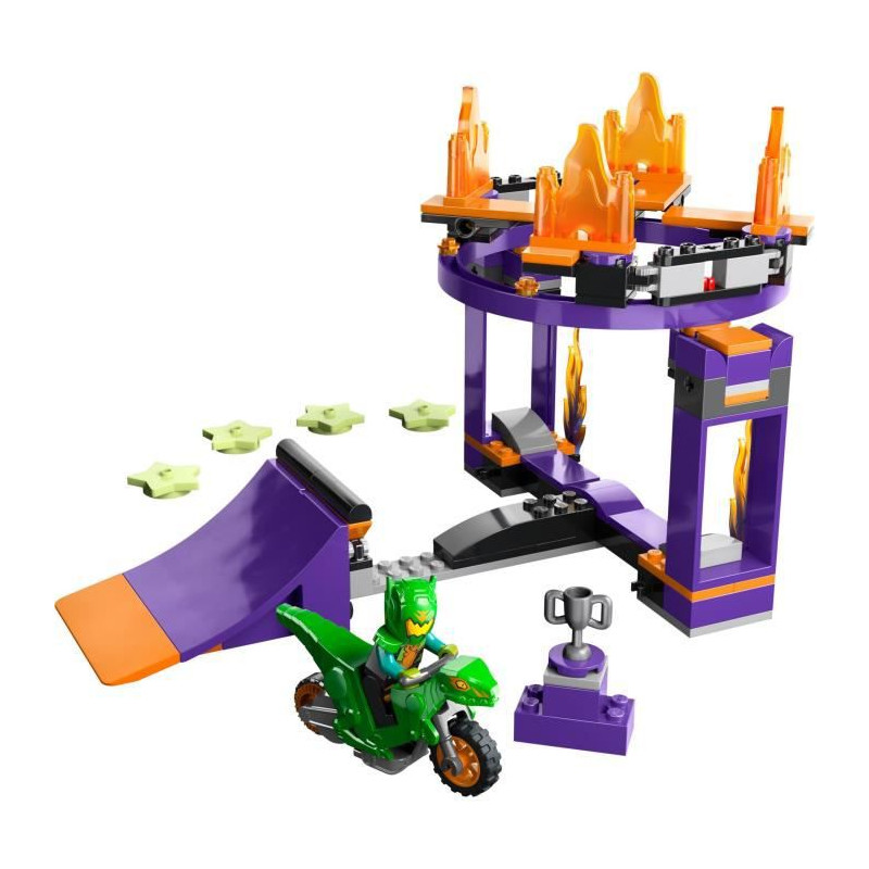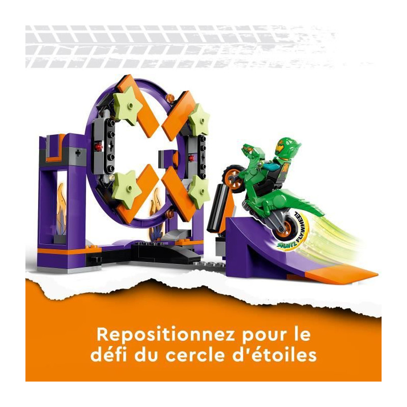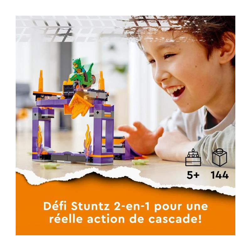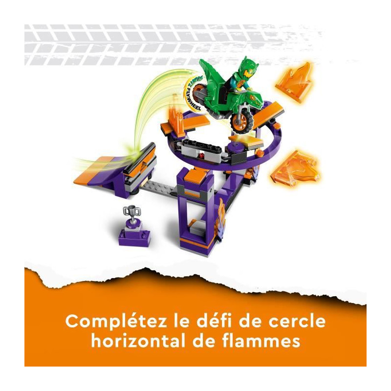 L'action monte d'un cran avec Le défi de cascade : le tremplin LEGO® City ! La superbe moto de cascade et la minifigurine du cascadeur a moto Stuntz annoncent de l'action palpitante.