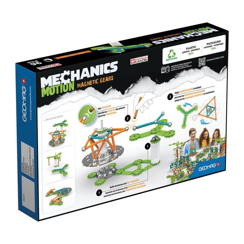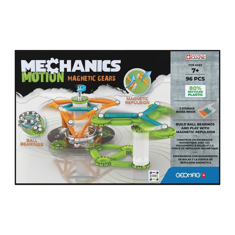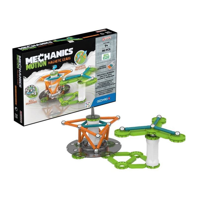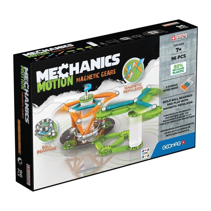 Mechanics EcoFriendly - 96 pcs Motion, Coffret composé de barrettes magnétiques et spheres mais aussi des accessoires pour vivre une nouvelle expérience Geomag avec des mouvements et la maitrise des flux magnétiques. Geomag utilise du plastique recyclé pour fabriquer ses produits. Tous les geomag sont compatibles entre eux.