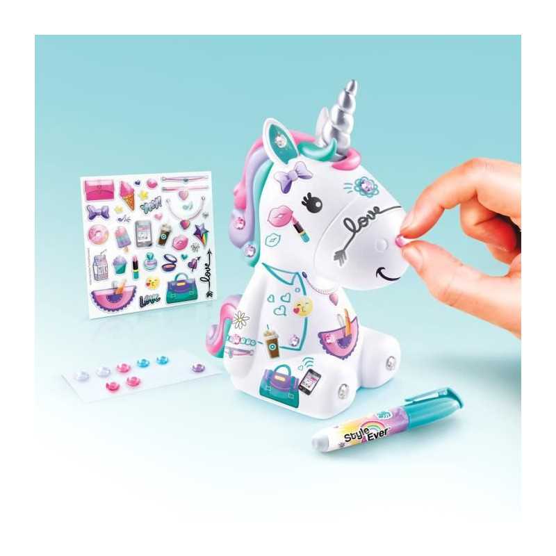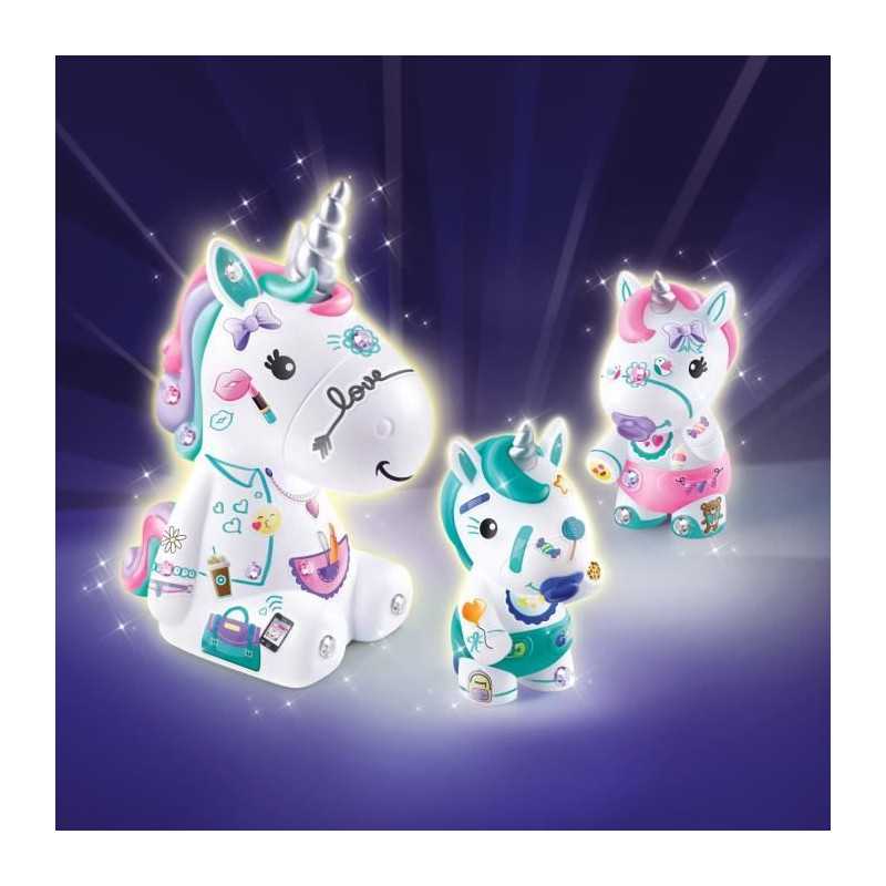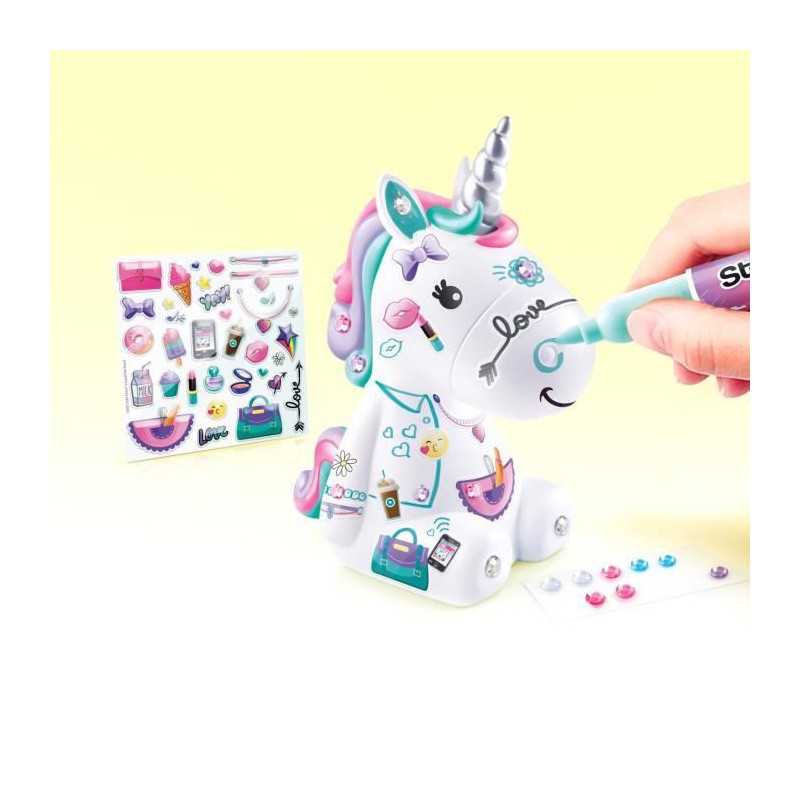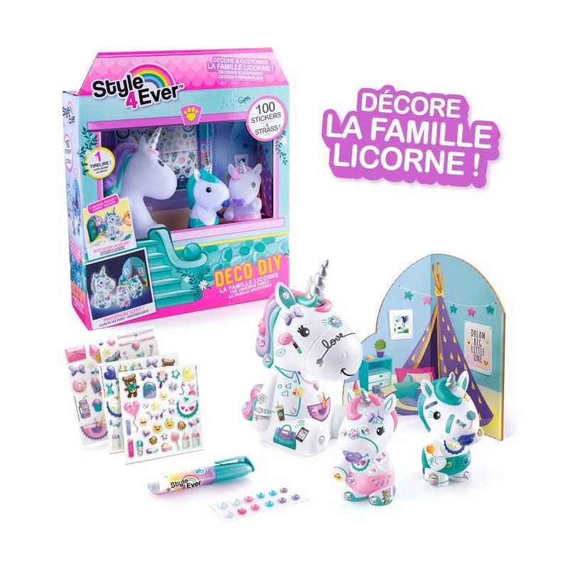 Un coffret composé d'une maman licorne et de deux bébés a personnaliser avec les accessoires fournis ! Exprime ta créativité en décorant tes figurines avec les 3 planches d'autocollants pailletés, la planche de strass et le feutre fournis. La maman licorne peut etre utilisée comme tirelire.