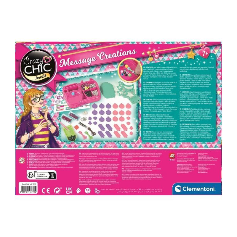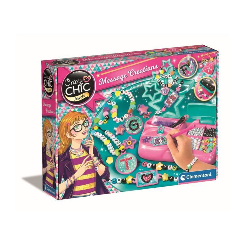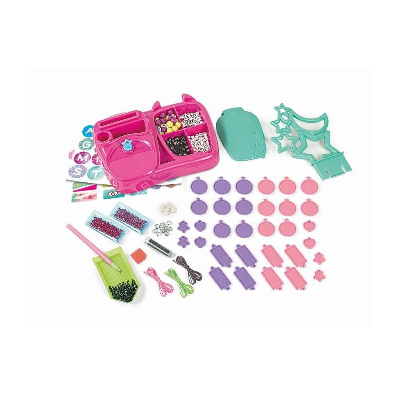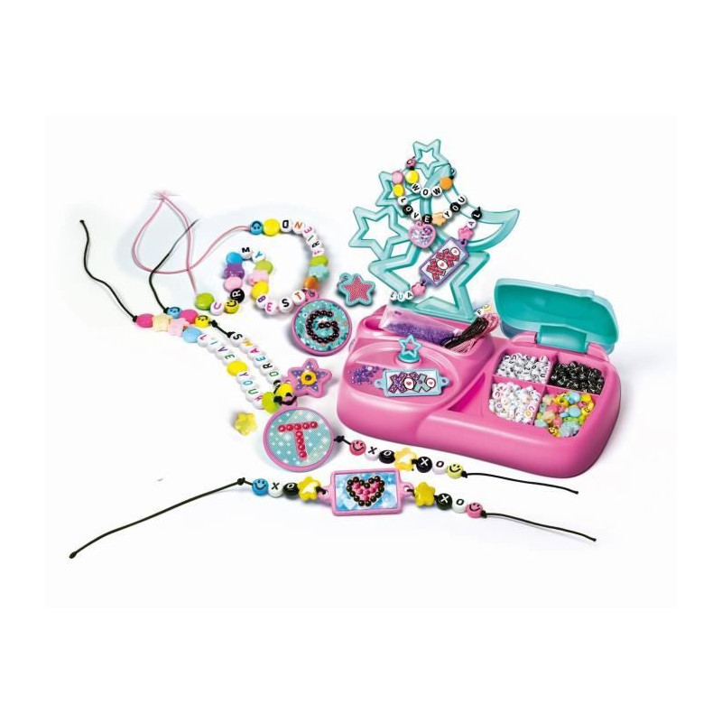 Un coffret pour créer des bijoux et accessoires super tendances avec des lettres, des perles colorées, des strass scintillants et des cordons élastiques. La base comporte trois parties : une zone pour décorer les pendentifs avec les strass colorés, un compartiment pour ranger les perles et un porte-bijoux pour exposer ses créations. Des bracelets et des colliers aux couleurs vives sur lesquels les petites filles pe