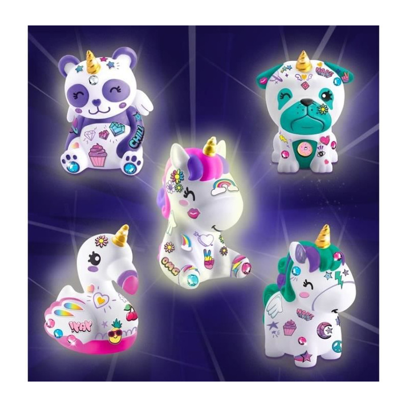 Décore ton mini personnage Licorne assise avec les stickers paillettes, les strass et le marqueur. Super ta création brille dans le noir, collectionne les 5 figurines !