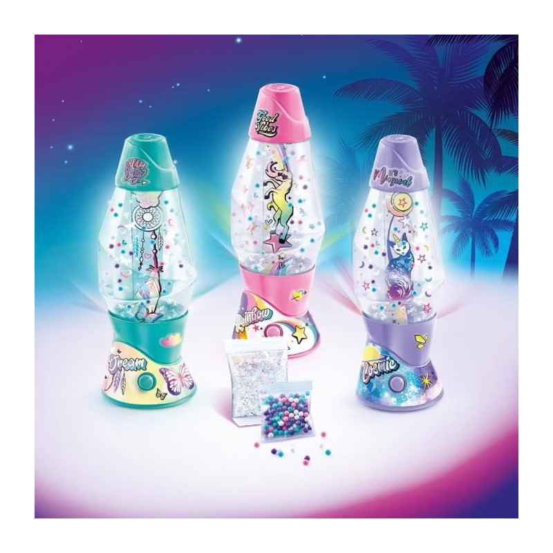 Fabrique ta propre mini lava lampe grâce aux accessoires inclus. Verse les décorations, ajoute de l'eau. Customise-la avec les stickers. 3 Themes a collectionner !
