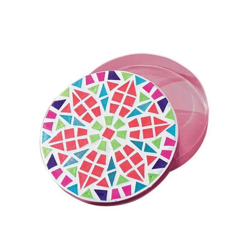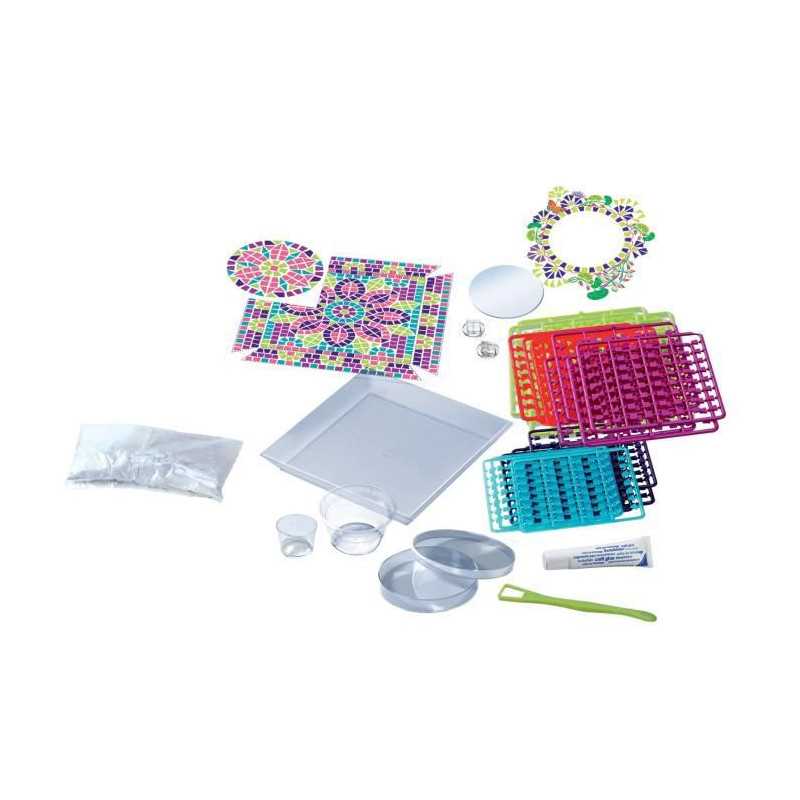Permet de réaliser 3 objets en mosaique : un plateau rangement, une boite a bijoux et un miroir. C'est grâce aux 5 couleurs de tesselles avec 4 formes différentes que tu peux confectionner tes objets. Des les réalisations faites, elles sont pretes a etre utiliser en décoration ou a offrir a tes proches