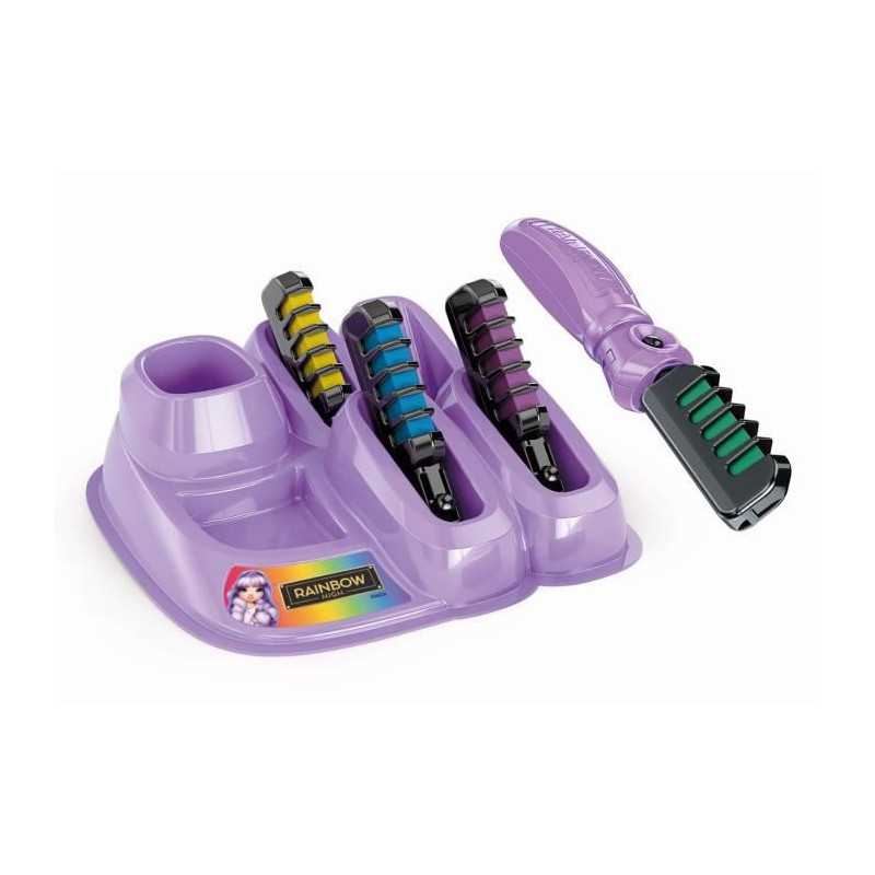 Pour des cheveux a la derniere mode et colorés comme ceux des Rainbow High, il existe un fantastique peigne magique ! Il suffit d'insérer dans le support le peigne avec le bâtonnet coloré choisi et de le passer dans ses cheveux. Amuse-toi a colorer chaque meche avec une couleur différente !