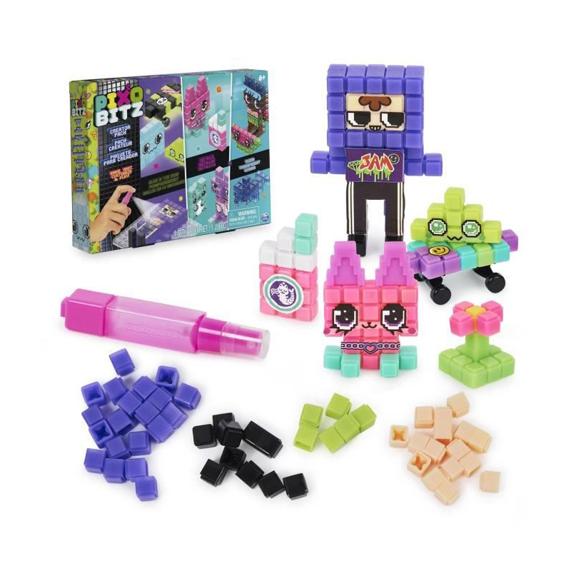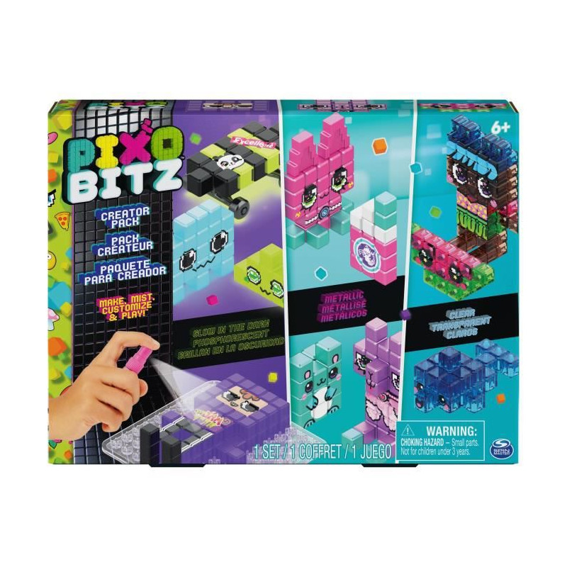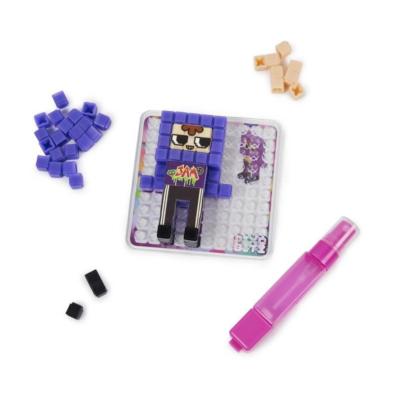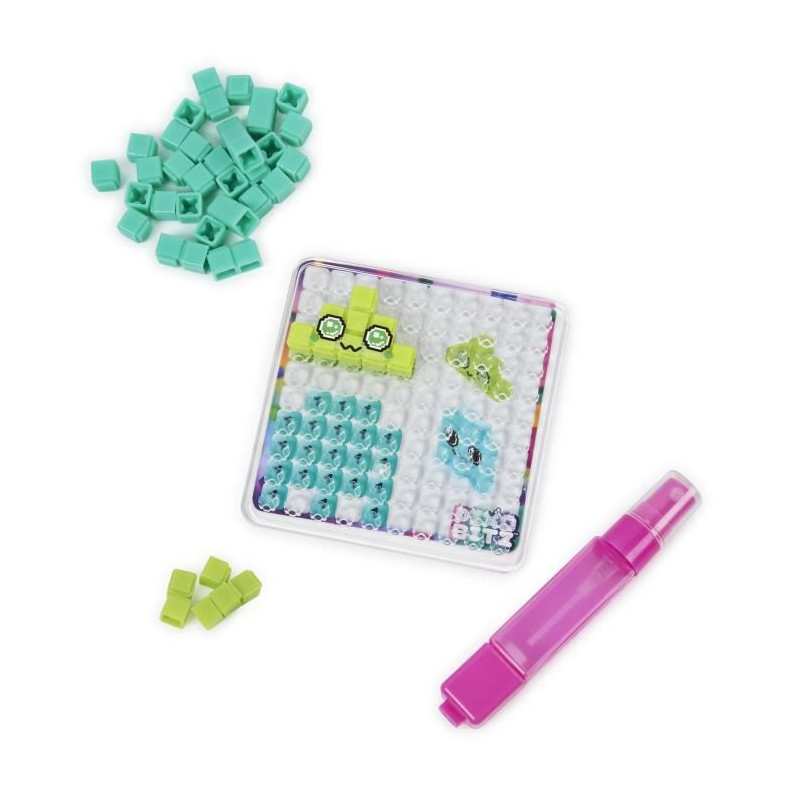 Un loisir créatif composé de bitz format pixel a assembler pour de jolies créations en 2D ou en 3D. Il suffit de placer les Bitz sur le plateau, de préparer sa création puis d'asperger d'eau grâce au stylo brumisateur. Il est ensuite possibe de personnaliser sa création en relief grâce aux différentes décorations et aux accessoires fournis. 12 créations possibles grâce au plateau et aux 515 Bitz métalliques, tr