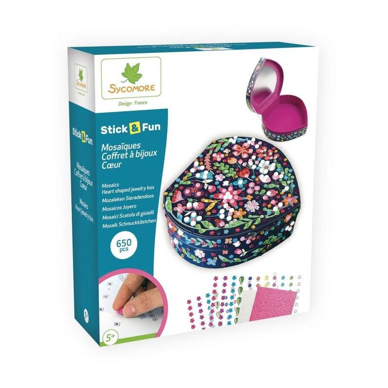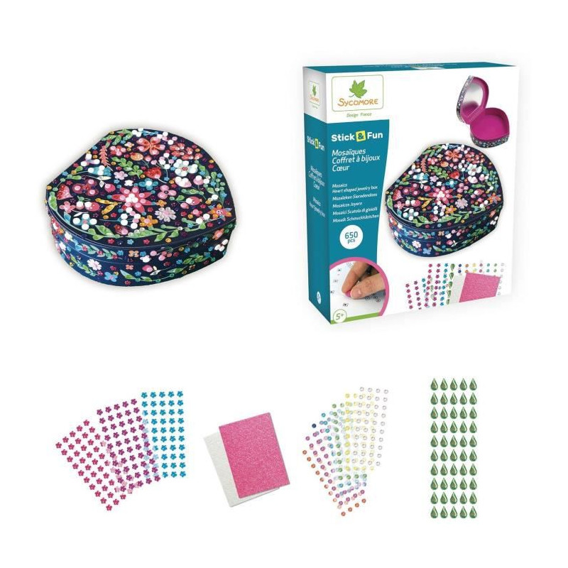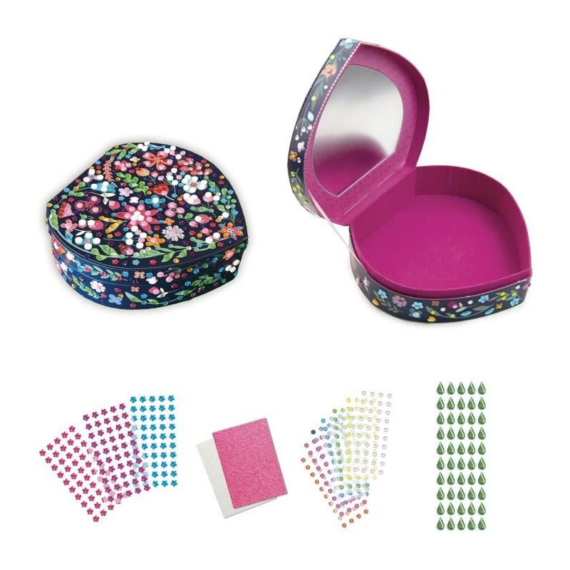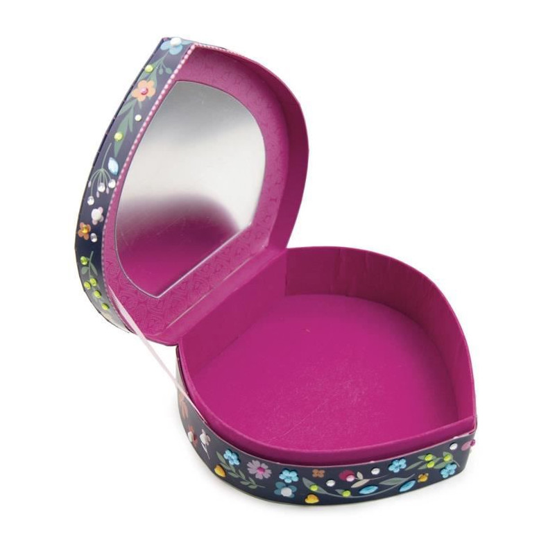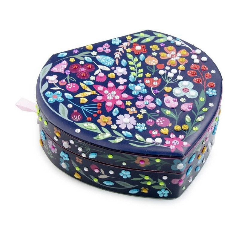 Ce coffret a bijoux en forme de coeur de 20 x 6 x 18,5 cm contient : plus de 500 mosaiques colorées, 150 gems et 1 notice d'instructions.