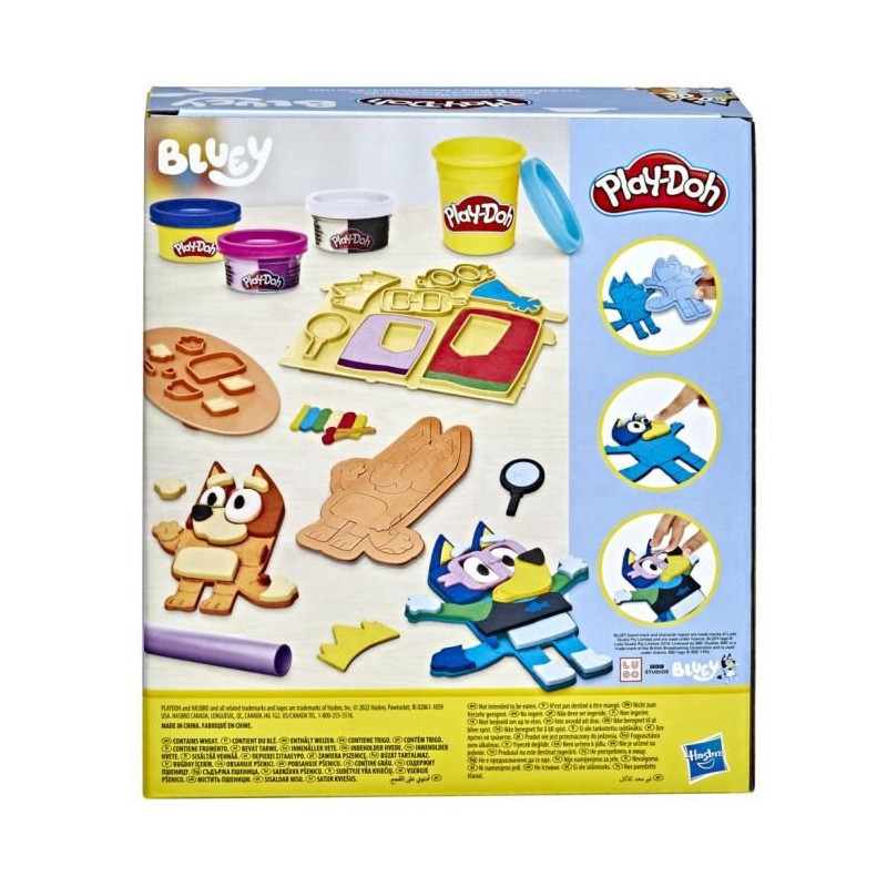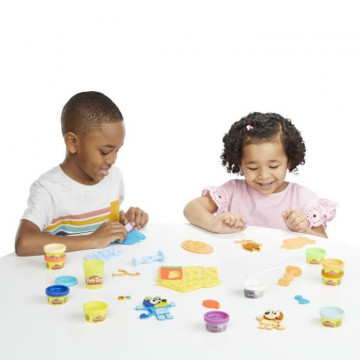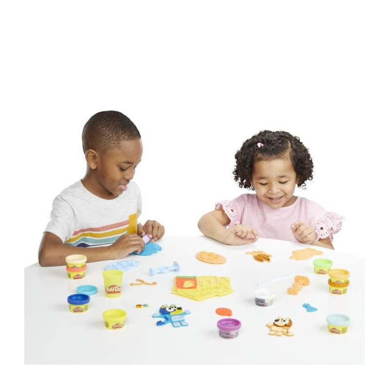 Les enfants se joignent a Bluey et a sa soeur Bingo pour un jeu de déguisement ! Ce coffret Play-Doh permet aux enfants (a partir de 3 ans) de recréer leurs scenes préférées du dessin animé alors qu'ils coupent, moulent et tamponnent des costumes pour ces 2 chiots joyeux.