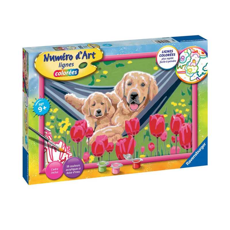 C'est facile, beau et amusant de peindre par numéro grâce aux lignes colorées pré-peintes ! Parmi les visuels grands formats a peindre et a accrocher, ce labrador entouré de tulipes saura ravir les enfants et compléter leurs collections. Ce produit est composé de matériaux issus de forets bien gérées certifiées FSC®, de matériaux recyclés et de matériaux issus d'autres sources contrôlées (FSC-C111262).