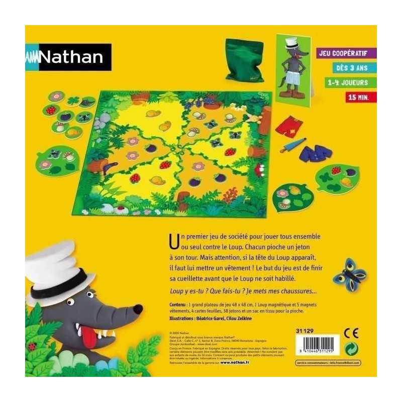 Nathan - Ce jeu de société éducatif reprend le theme connu du grand méchant loup. Vite, vite! Il faut avoir terminé sa récolte avant que le loup ne soit completement habillé! La regle du jeu propose aux enfants deux modes de jeu différents : tous ensemble contre le loup ou chacun pour soi. jeu d'équipe tres original qui apprend aux enfants les valeurs coopératives - Mixte - A partir de 3 ans - Livré a l'unité
