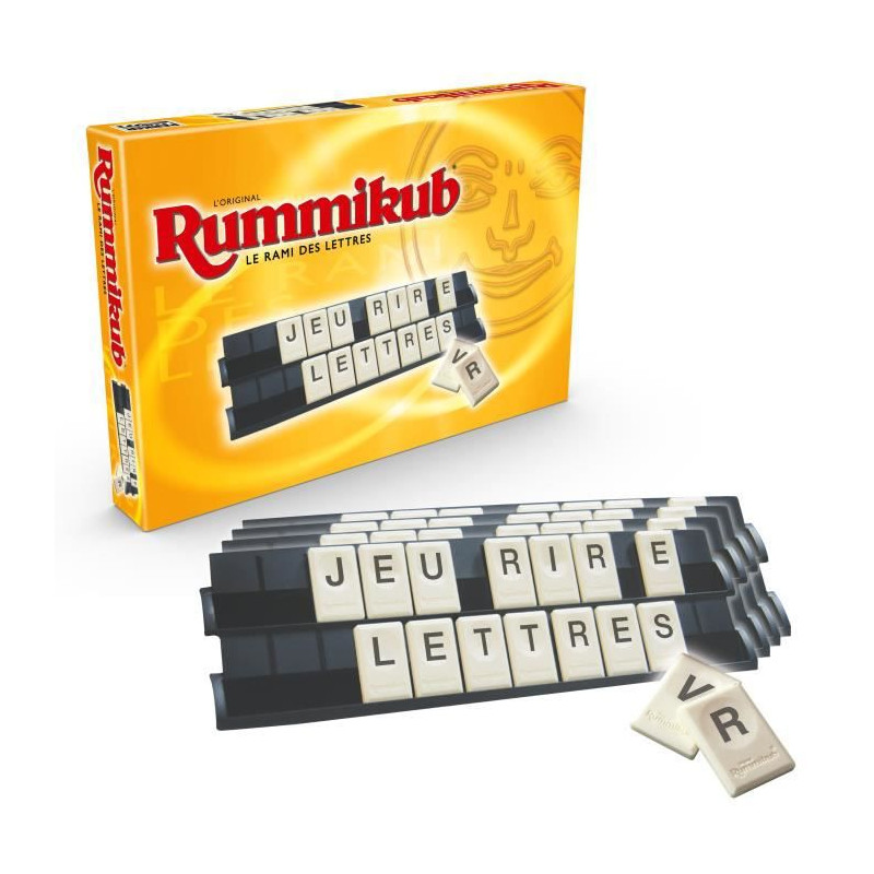Rummikub Lettres : jeu de société où le but du jeu est de marquer le plus grand nombre de points en vous débarrassant des lettres de votre réglette pour gagner. Version française.Principe du jeu : Combinez avec les mots déja posés sur la table avec des lettres de votre réglette pour créer de nouveaux mots. Créez les mots les plus longs pour marquer le plus de points !2 a 4 joueurs. Temps de la partie : environ 30 mi