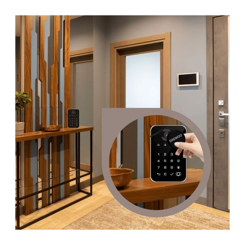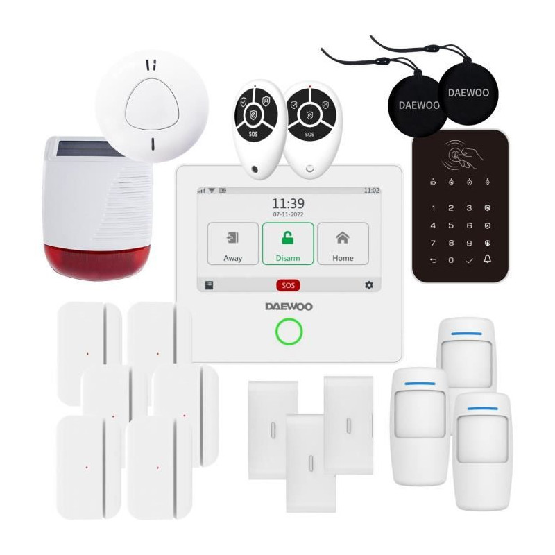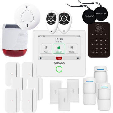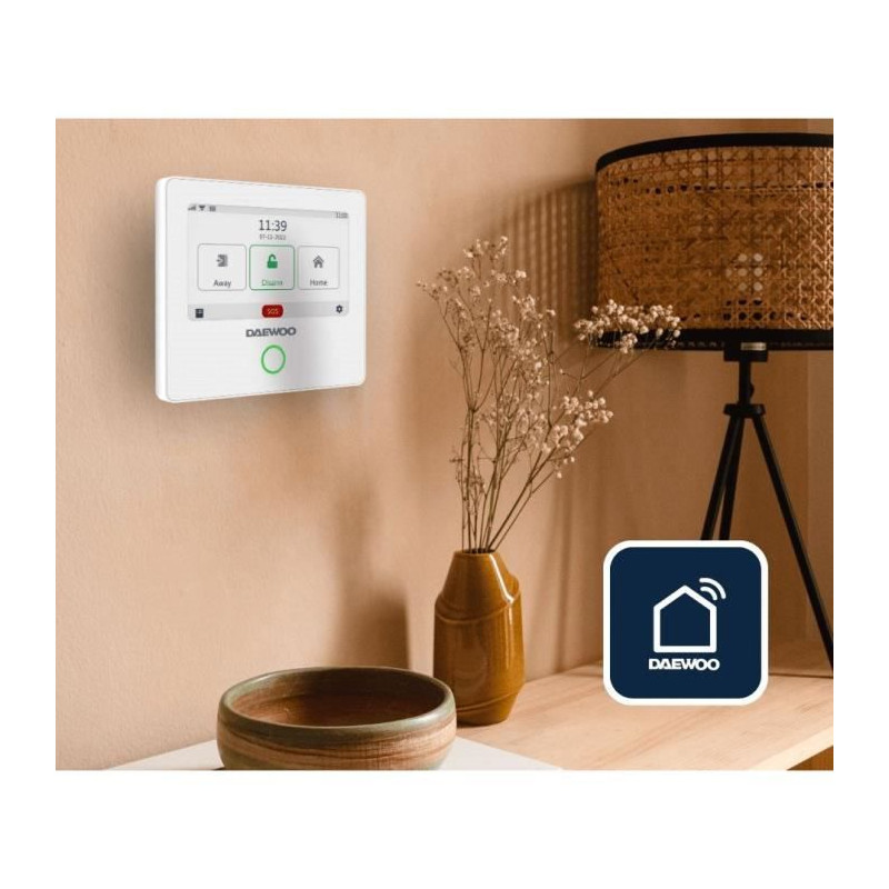 Alarme Daewoo AM313 avec centrale a écran tactile AM301, connecté, sécurité de la maison, ouverture de porte, détection de mouvement adapté aux animaux, vibrations, clavier sans fil et sirene extérieure solaire. Détecteur de fumée connecté. Contrôle a distance depuis votre smartphone et notification d'alerte pour agir rapidement.