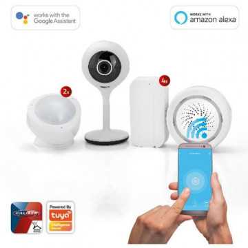 Kit de sécurité 1 caméra intérieur 1 caméra extérieur 4 contacteurs de portes et fenetres 2 détecteurs de mouvements 1 détecteur d'eau 1 détecteur de fumée 1 sirene