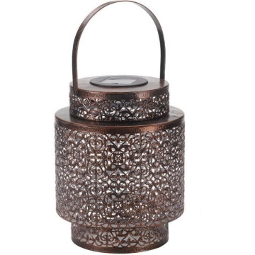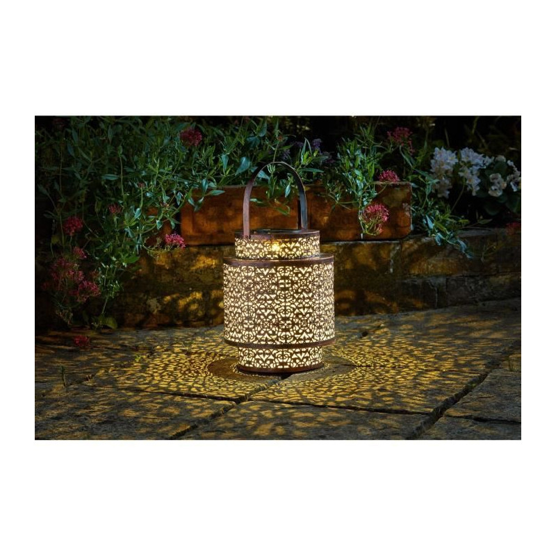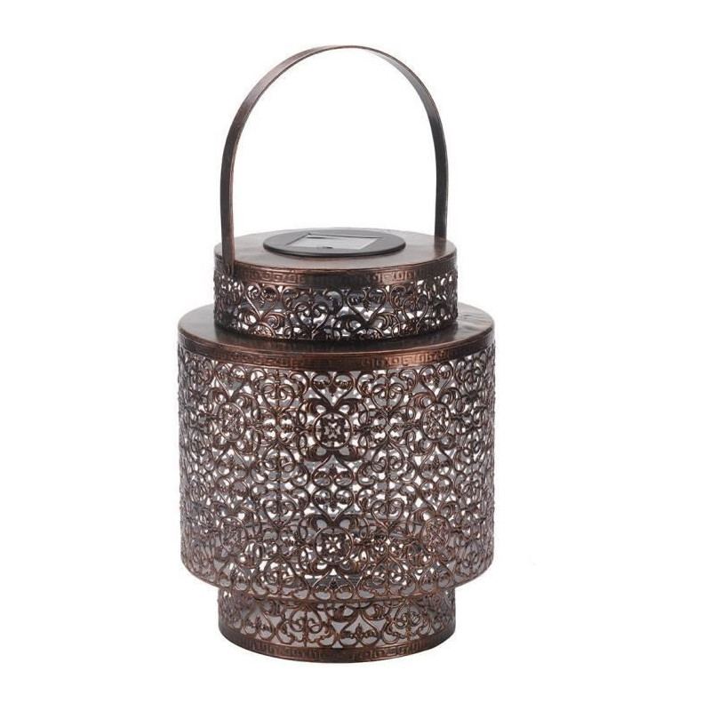 Lanterne décorative en métal a poser sur une table ou un muret. Design oriental. S'illumine automatiquement au crépuscule Facile a utiliser - pas de câblage secteur Temps de fonctionnement minimum de 6 heures lorsqu'elle est completement chargée. 22.5 x 19 x 19cm