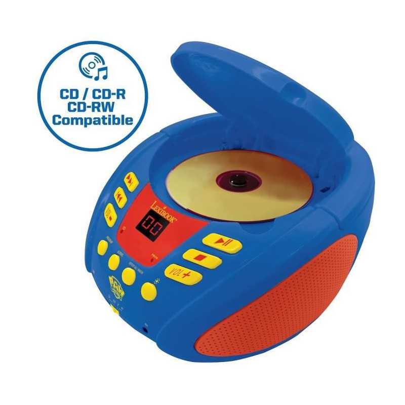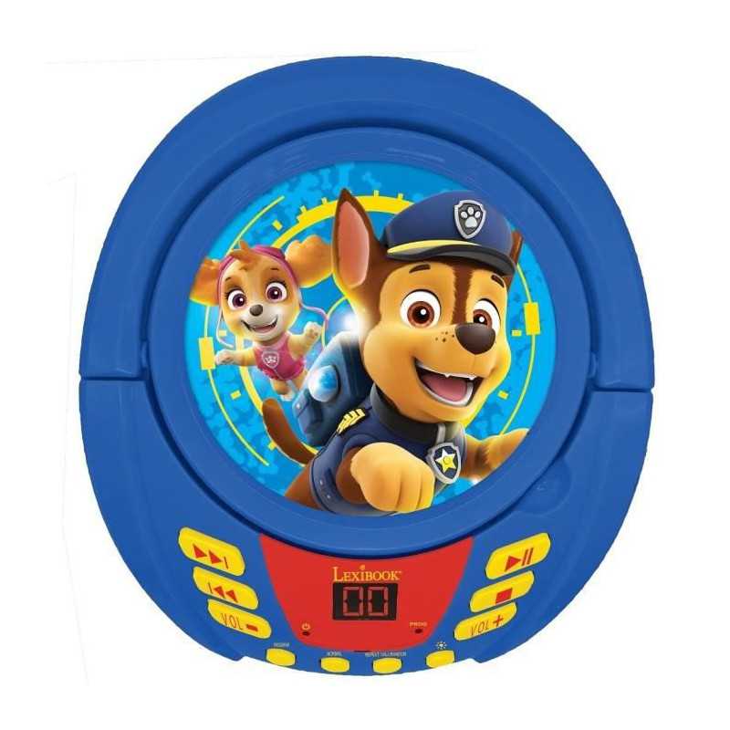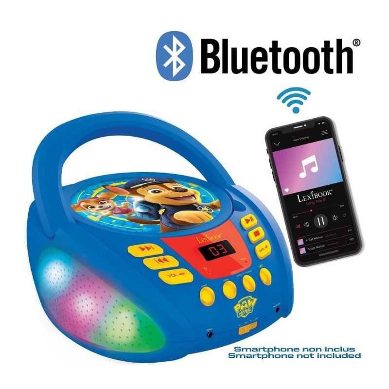 Le lecteur CD (CD/CD-R/CD-RW) transportable Paw Patrol : Pat' Patrouille avec de nouveaux effets de lumiere multicolores, parfait pour les enfants ! Bluetooth 5.0, se connecte sans fil aux smartphones, tablettes et autres appareils Bluetooth ! Prise microphone (micro non inclus) pour le transformer en karaoké et chanter avec les héros de la Pat' Patrouille, Chase et Stella ! Entrée audio auxiliaire pour tablettes