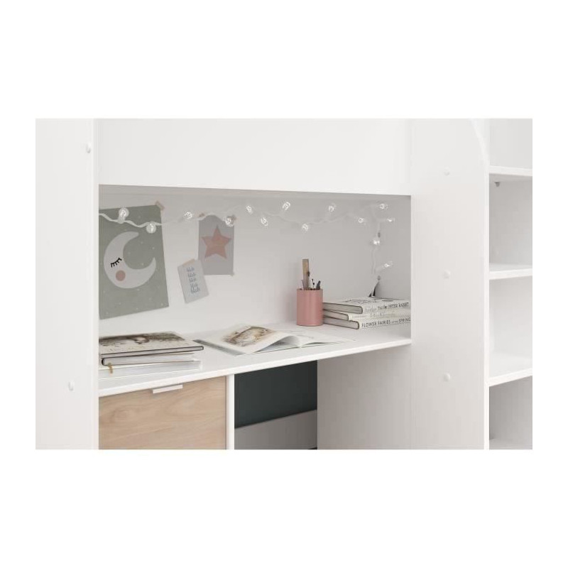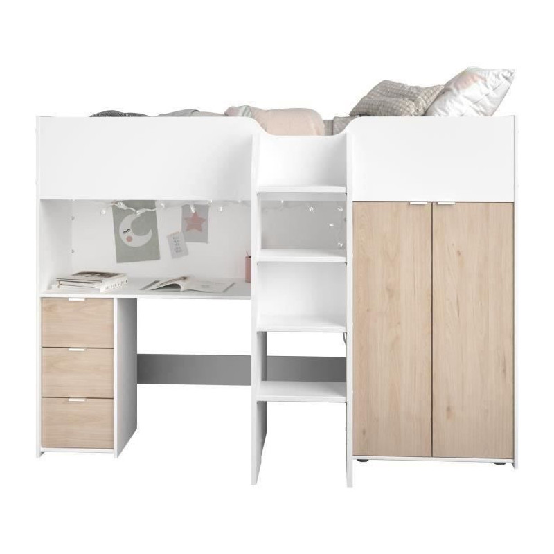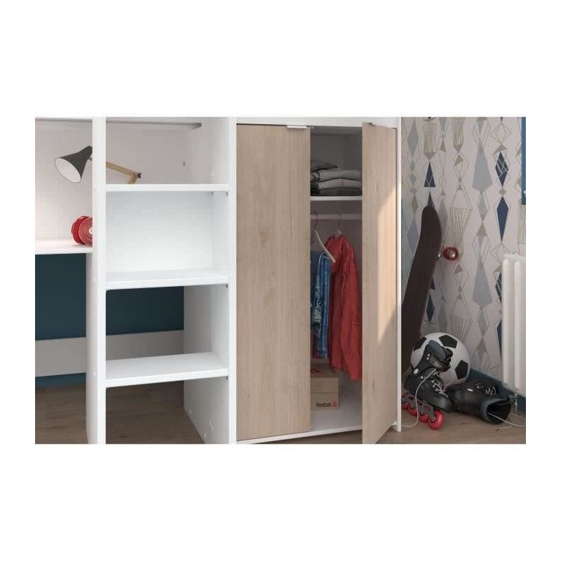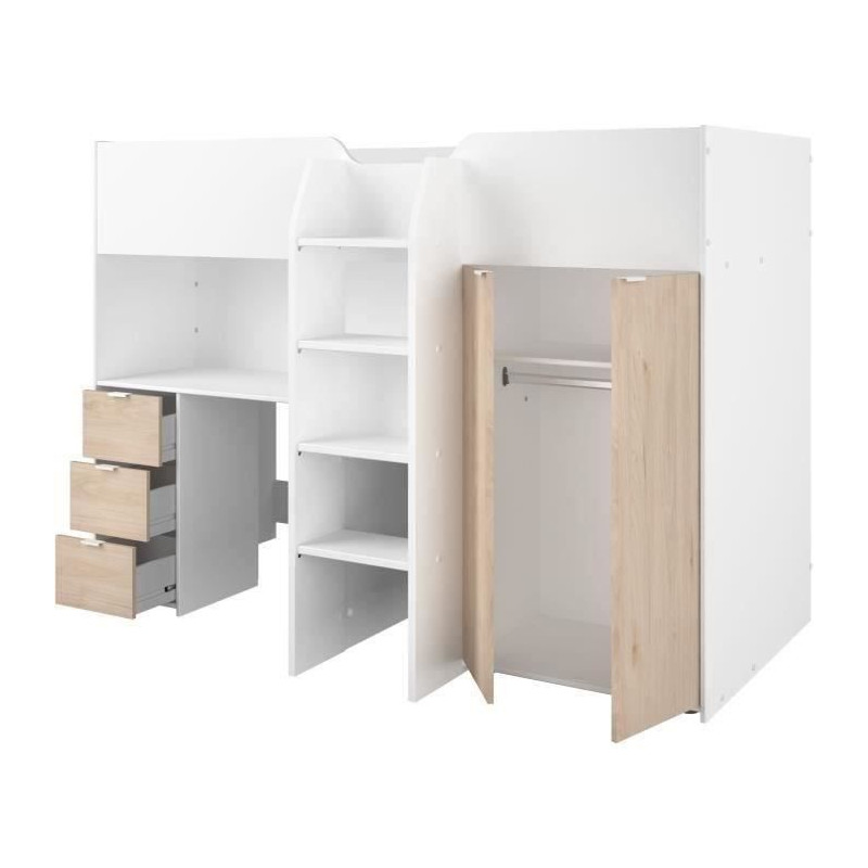 TOM Lit mezzanine combiné composé d'une armoire 2 portes comprenant une étagere et une barre de penderie - Un bureau 3 tiroirs - Structure en panneaux de particules revetus de papier décor - Coloris Blanc et Chene - Couchage 90 x 200 cm - - Sommier en panneau inclus - Livré sans matelas - Dimensions: L203 x P94,6 x H146,2 cm - Ne convient pas aux enfants de moins de 6 ans ** PRODUIT PLUS RESPONSABLE - MADE IN