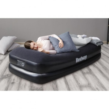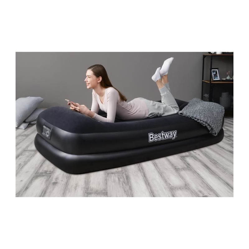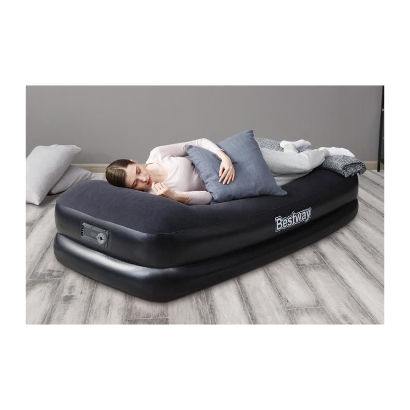 Lit gonflable matelas - 1 place - 191 x 97 x 46 cm - Pompe électrique 220-240 volts intégrée : gonflage et dégonflage - Vinyle tres résistant - Oreiller intégré - Confortable surface de sommeil floquée - Construction alvéolaire en Tritech - Se gonfle en 180 secondes - Utilisation intérieur - Sac de voyage inclus