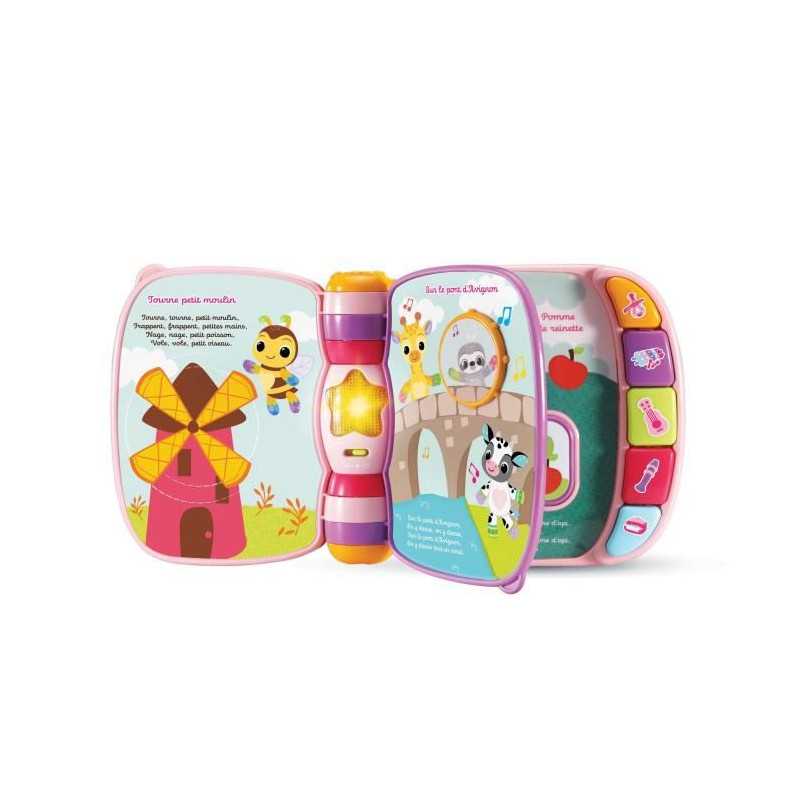 Super livre enchanté des Baby loulous rose - 6 - 36 mois Un livre parlant et musical avec 6 comptines traditionnelles a écouter : Dansons la Capucine, Frere Jacques... 5 boutons colorés pour jouer du piano et découvrir différents instruments de musique et leur son. Des animaux ou des objets en relief a manipuler pour déclencher des effets sonores et des petites phrases. Étoile lumineuse qui clignote au ryth