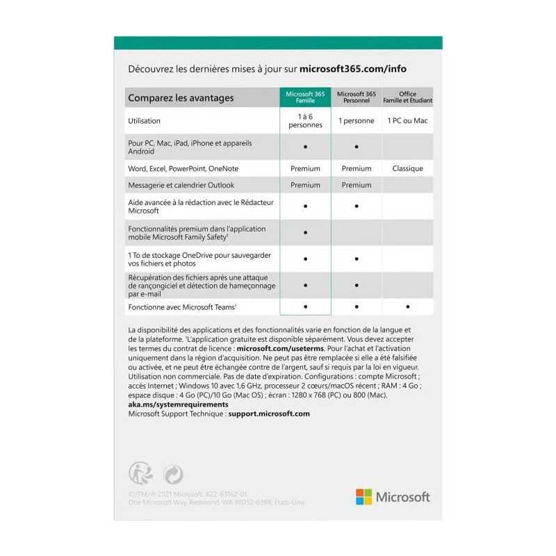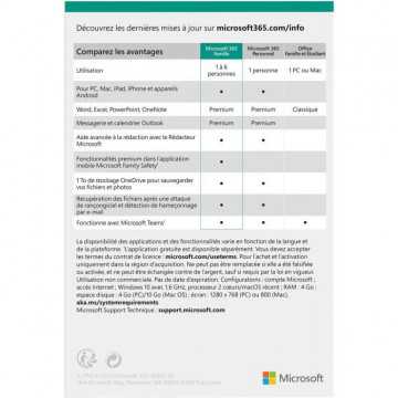 Microsoft 365 Famille est le meilleur moyen de rester connecté et productif avec votre famille. Avec un abonnement d'un an, vous pouvez connecter jusqu'à six utilisateurs à Microsoft 365 et bénéficier des applications Office sur PC ou Mac, ainsi que des 1 To de stockage en ligne OneDrive par utilisateur. Microsoft 365 Famille offre également aux utilisateurs une sécurité avancée pour protéger leurs données et leurs appareils contre les menaces en ligne. Vous pouvez également partager des calendriers, des listes de tâches et des photos entre les membres de votre famille. Microsoft 365 Famille est la solution idéale pour rester connecté et productif avec votre famille.