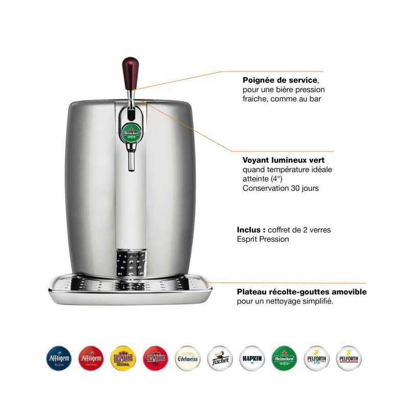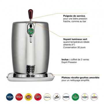Machine a biere Beertender 5 L + 2 verres - Coloris Silver - Pour 6 variétés de biere (Heineken, Affligem, Affligem Carmin, Desperados, Pelforth et Edelweiss) - Conteneur de biere en acier - Refroidissement jusqu'a 4 °C.
