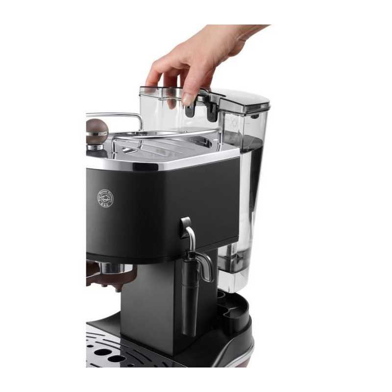 Machine a expresso pompe - Puissance : 1100 W - Pression : 15 bars - Réservoir transparent : 1,4 L - Auto amorçage - 3 boutons : on/off, expresso /eau chaude et vapeur - 2 thermostats distincts pour l'eau et la vapeur - Vapeur ajustable - Bac récolte goutte amovible - Tasse mouture intégré - Chaudiere en inox - Coloris Noir Mat / Base et poignée Chocolat