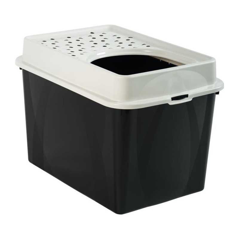 Bac a litiere "Berty". Toilettes modernes pour chats avec ouverture sur le dessus. Une ouverture généreuse également adaptée aux grandes races de chats. Un contenant large et profond pour que chaque chat puisse trouver sa place. Les hautes parois latérales assurent une protection contre les fuites et réduisent considérablement la quantité de litiere répandue autour des toilettes. Il est muni d'un couvercle amovible p
