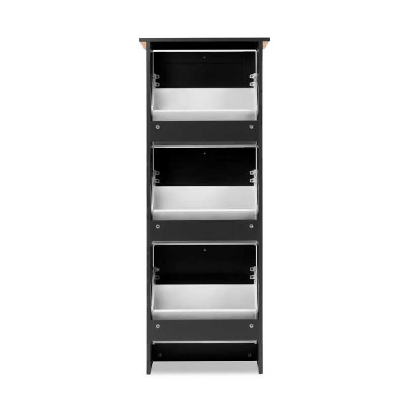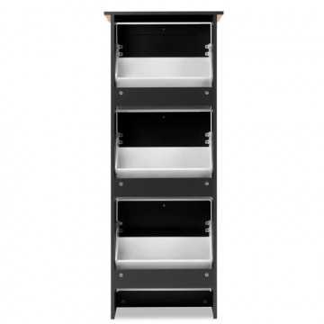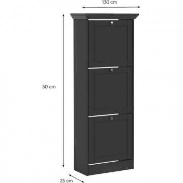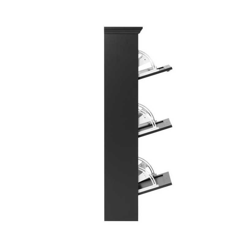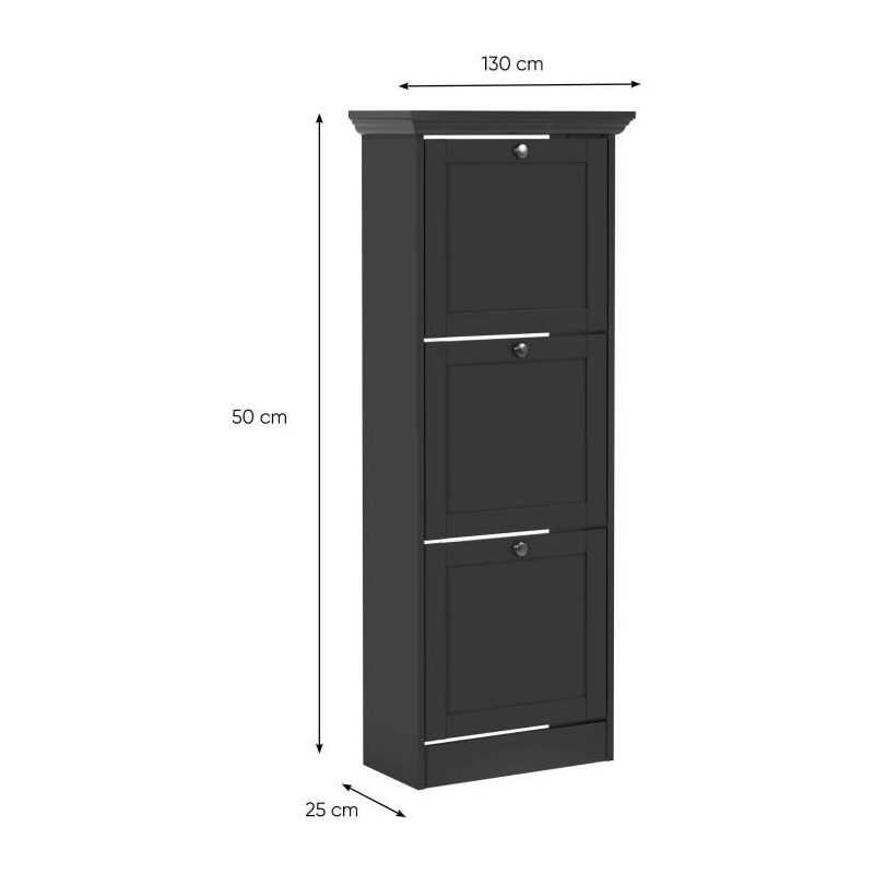 Dotée d'une couleur gris anthracite moderne, de jolies poignées en métal et d'une corniche en MDF, l'armoire possede 3 abattants avec deux compartiments chacun, ce qui permet de loger jusqu'a 12 paires de chaussures. Il est important de bien fixer l'armoire a chaussures au mur.