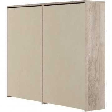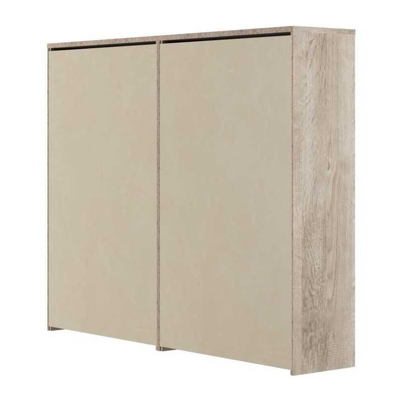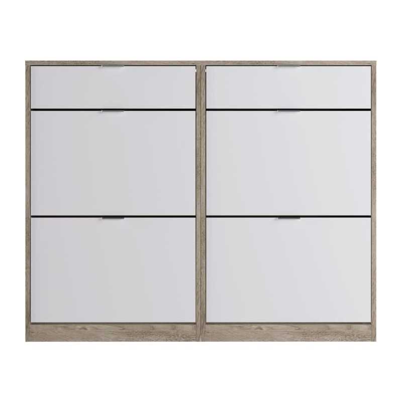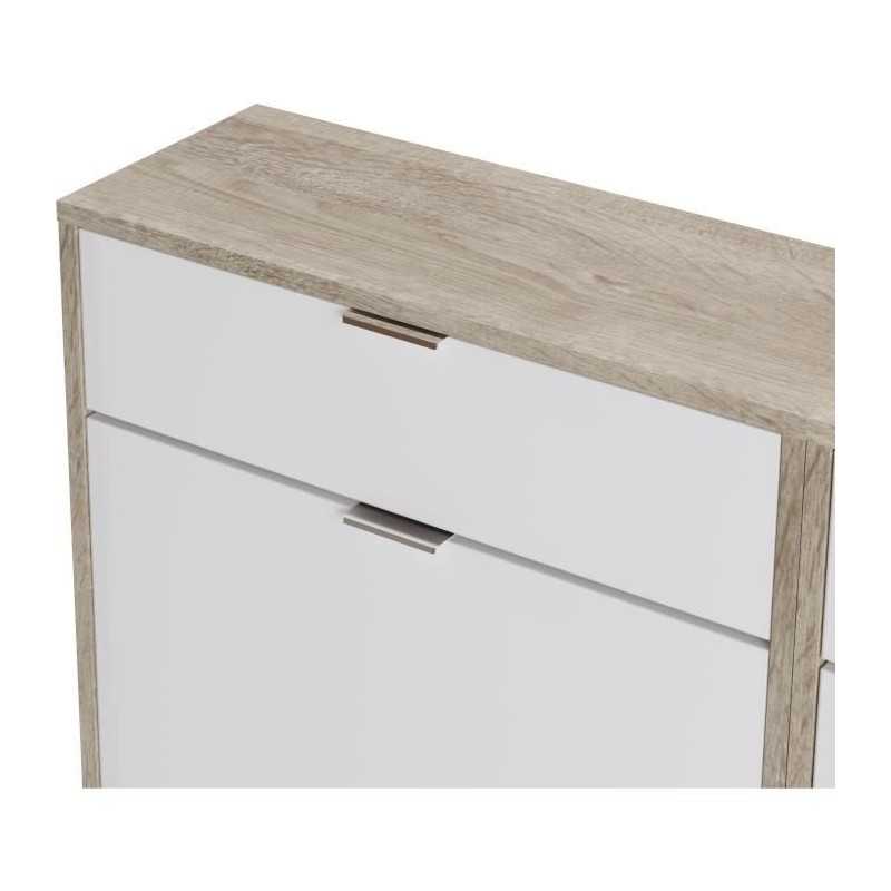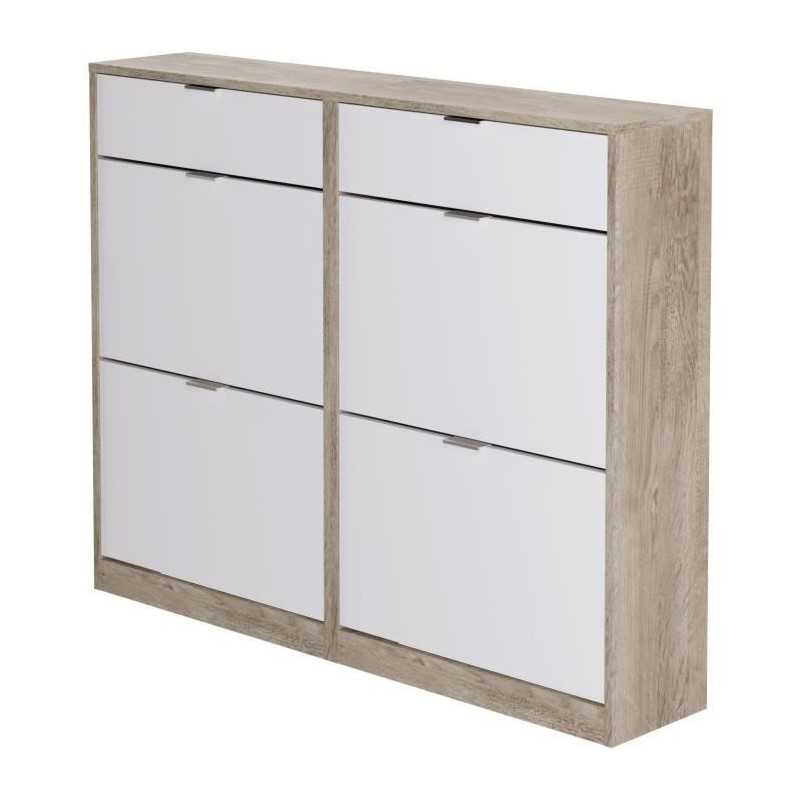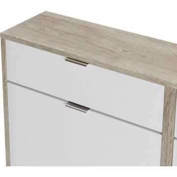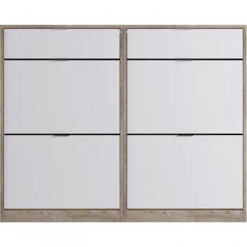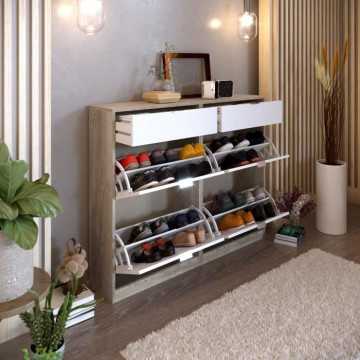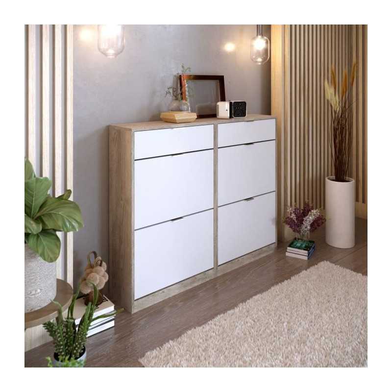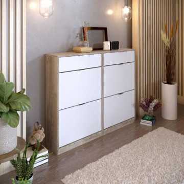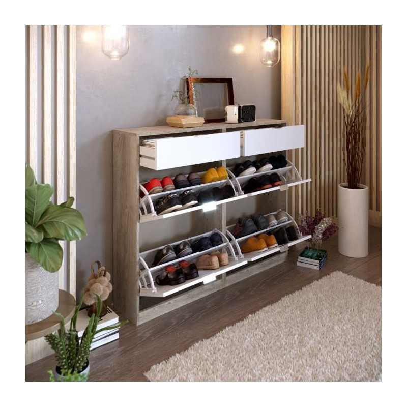 Meuble a chaussures avec 4 portes + 2 tiroirs fabriqué en melamine chene pour le corps du meuble et mélamine blanche pour les portes. Poignées en ABS gris. Capacité 24-28 paires de chaussures.