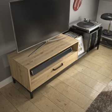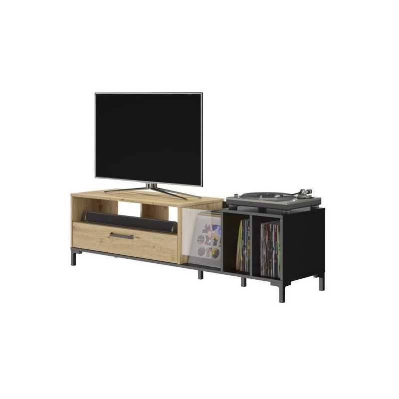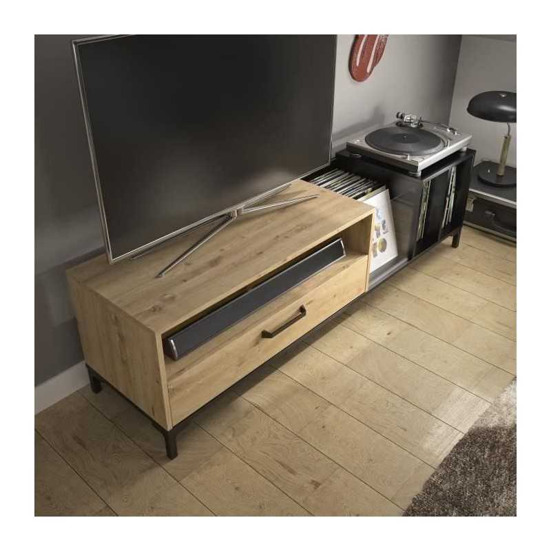 DIAGONE Meuble TV Vinyles - Décor chene et noir - Made in France - L 198 x H 51 x P 45 cm - PYLA