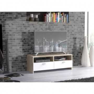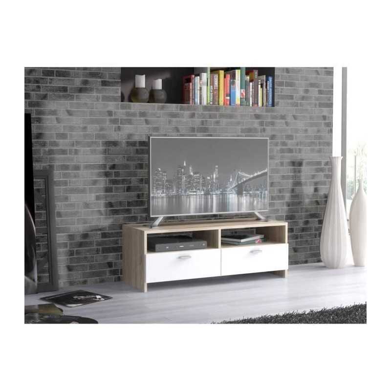 Meuble TV HELPPO - En panneaux de particules blanc et décor chene - Style et design contemporain - Le meuble est muni de 2 abattants et de 2 niches - Les poignées sont en plastique effet aluminium - Fabrication européenne - Dimensions L 95 x P 34,6 x H 35,8 cm.