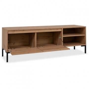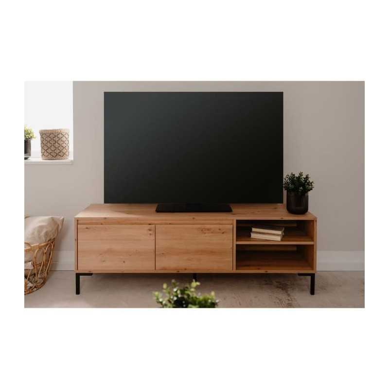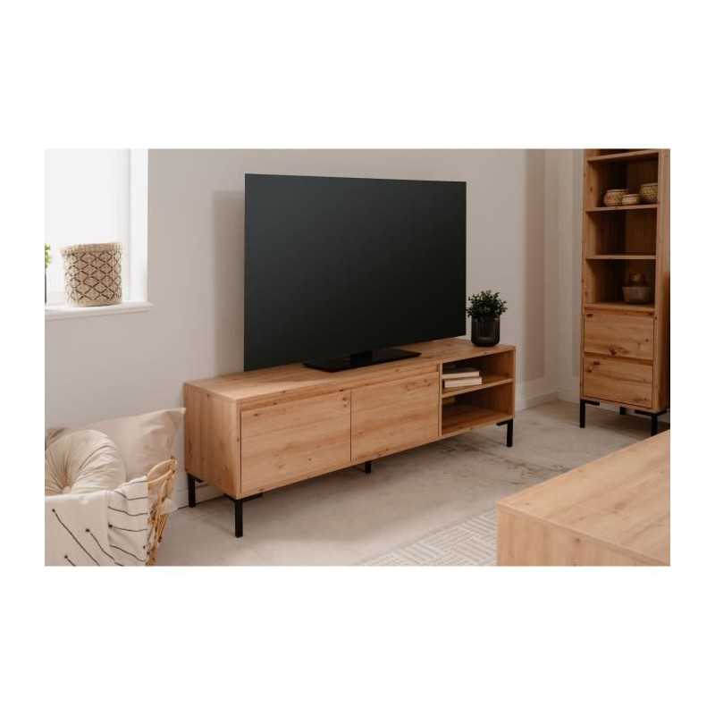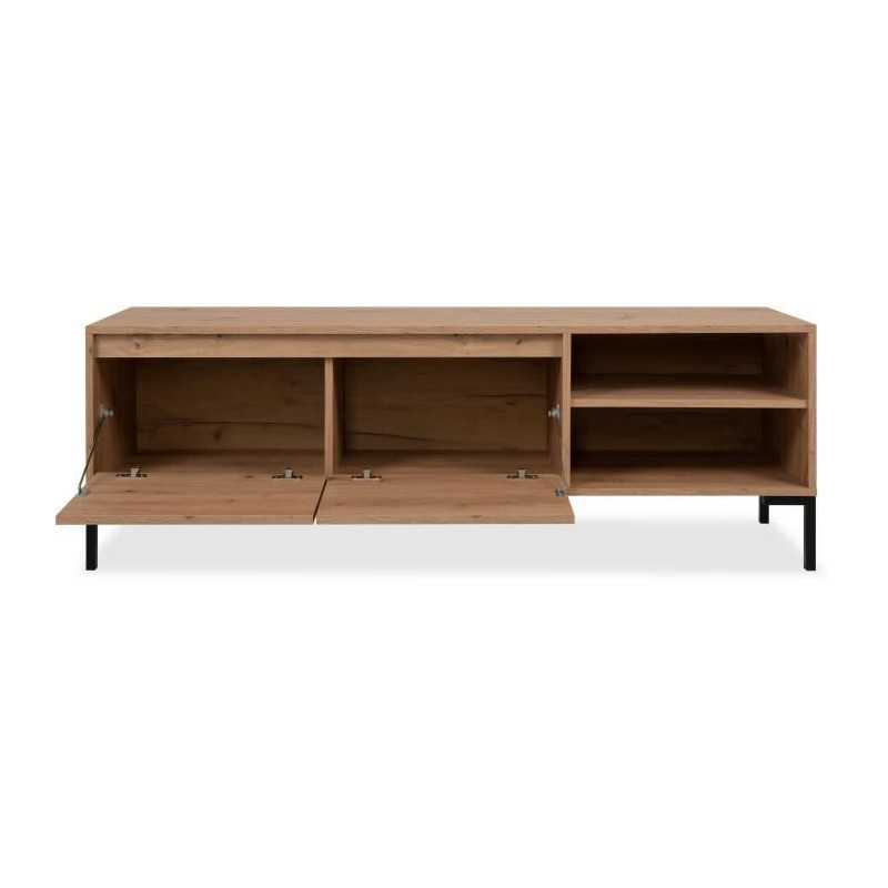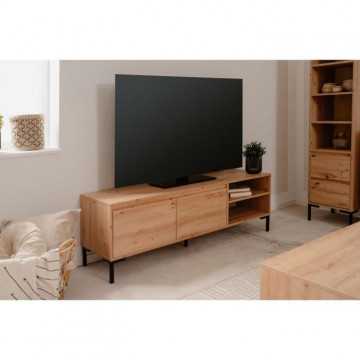 Korsika est une gamme de produits au style industriel avec son coloris chene artisan et ses pieds noirs en métal. Ce meuble TV est tres fonctionnel, il possede 2 abattants et 2 niches, vous pourrez ainsi stocker tous vos appareils. Il y a également un passe-câbles a l'arriere. De plus, ce produit est fabriqué en UE