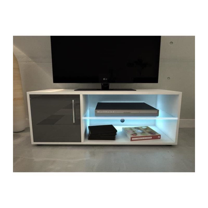 Plus qu'un support fiable pour votre télévision, le meuble TV KORA contemporain avec éclairage LED laqué gris - L 100 cm s'offre comme une solution de rangement pour vos CD et DVD (derrière la porte). Le Kora meuble TV 100 cm est également pourvu d'une niche avec étagère en verre pour vos lecteurs multimédia, et d'un éclairage LED pour tout mettre en valeur.