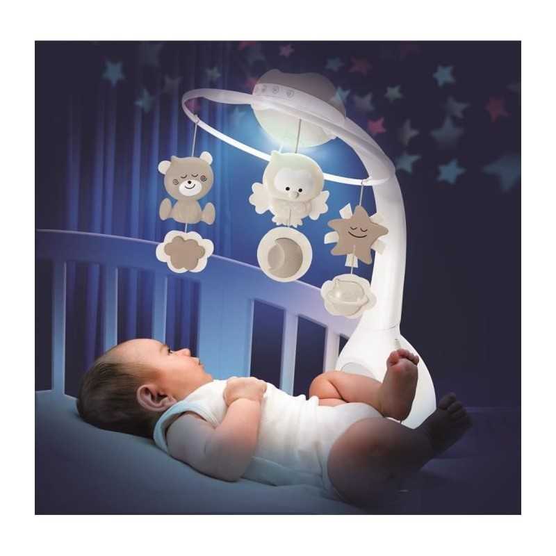 Mobile et projecteur multi-étape pour calmer et réconforter Bébé - Adorables animaux flottant -Musique apaisante et douce lumiere - Projecteur de lumiere qui projette des motifs étoilé sur le mur ou sur le plafond - Séquences de 30 minutes permettant aux lumieres et aux sons de s'estomper progressivement.