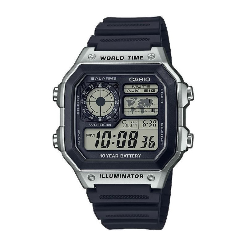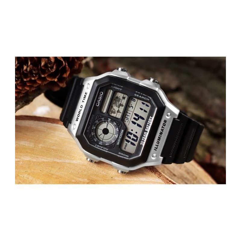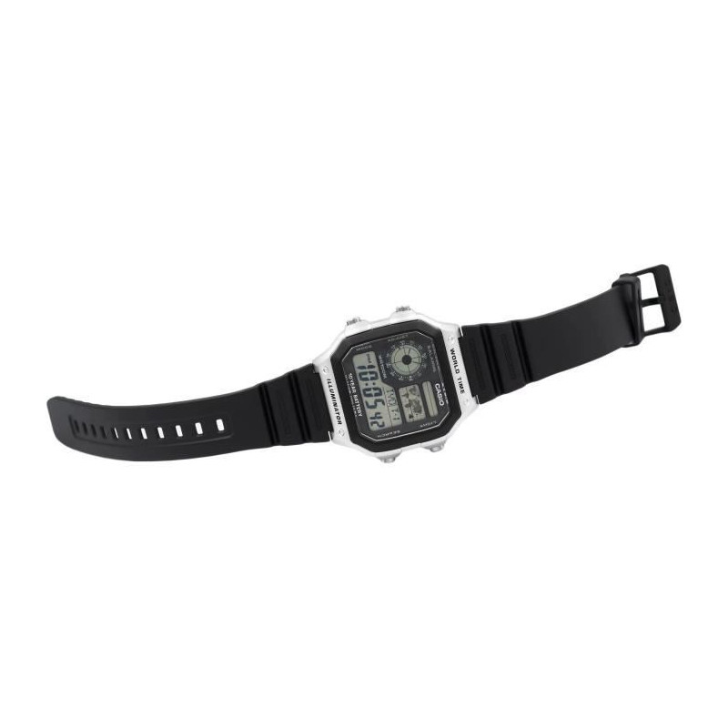 Éclairage LED Fonction d'heure universelle Chronometre 1/100 s - 24 heures Comptes a rebours - 1/1 sec - 24 heures 5 alarmes quotidiennes Marche/Arret bip sonore des touches Calendrier automatique Format de l'heure 12/24 heures Verre acrylique Boîtier en résine
