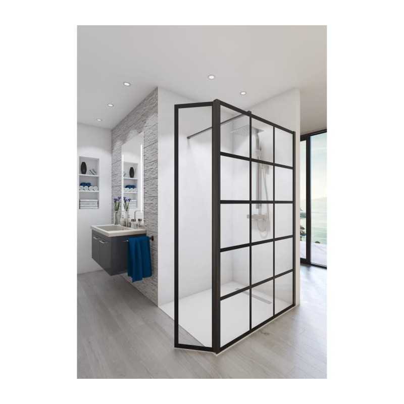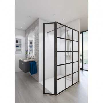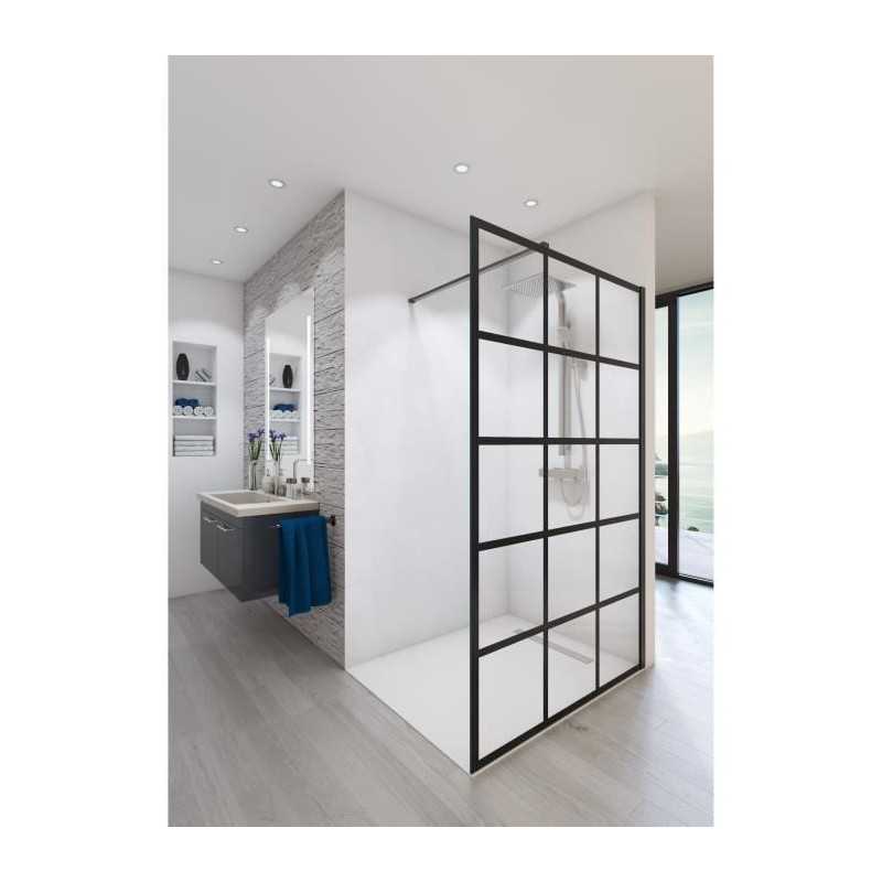 AURYS Paroi de 1400 mm de large - Verre Timeless by Saint-Gobain 8 mm , trempé selon EN12150, sérigraphie noire en extérieur. Quincaillerie noire mat. Fabrication française Saint-Gobain
