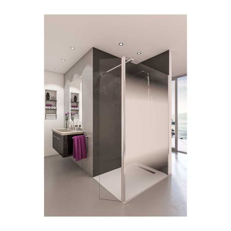 AURYS Paroi de 1400 mm de large - Verre Timeless by Saint-Gobain 8 mm, trempé selon EN12150, sérigraphie effet brume en extérieur. Quincaillerie chrome. Fabrication française Saint-Gobain