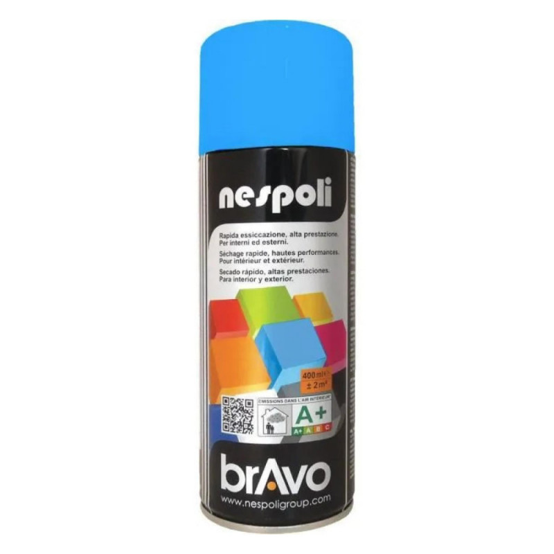 La peinture aérosol bleu azur 400ml UV2 NESPOLI est une peinture de décoration qui sapplique à de nombreux support comme le bois, losier, le métal, lacier, laluminium, le verre, la céramique, la pierre, le marbre, le papier, le plastique, à lintérieur comme à lextérieur. Dotée dune formule ultra couvrante, cette peinture de NESPOLI offre une surface lisse sans trace et une finition parfaite.