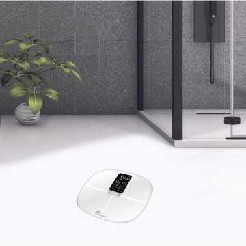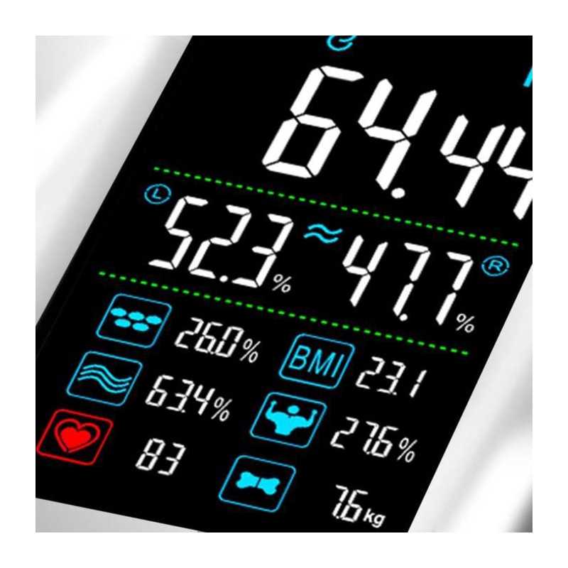 Poids, IMC, graisse, eau, muscles, et rythme cardiaque, votre forme en 15 données - Technologie 4 contacts - Synchronisation Bluetooth - Utilisation avec et sans smartphone - Ecran XXL 105 x 60 mm - Plateau verre trempé 300 x 270 mm - 10 utilisateurs - Mode athlete - Piles incluses - Garantie 5 ans