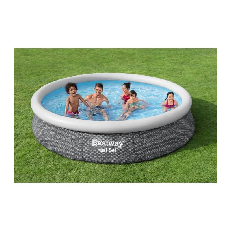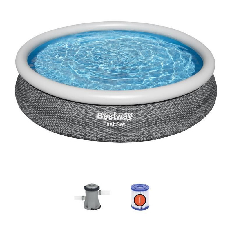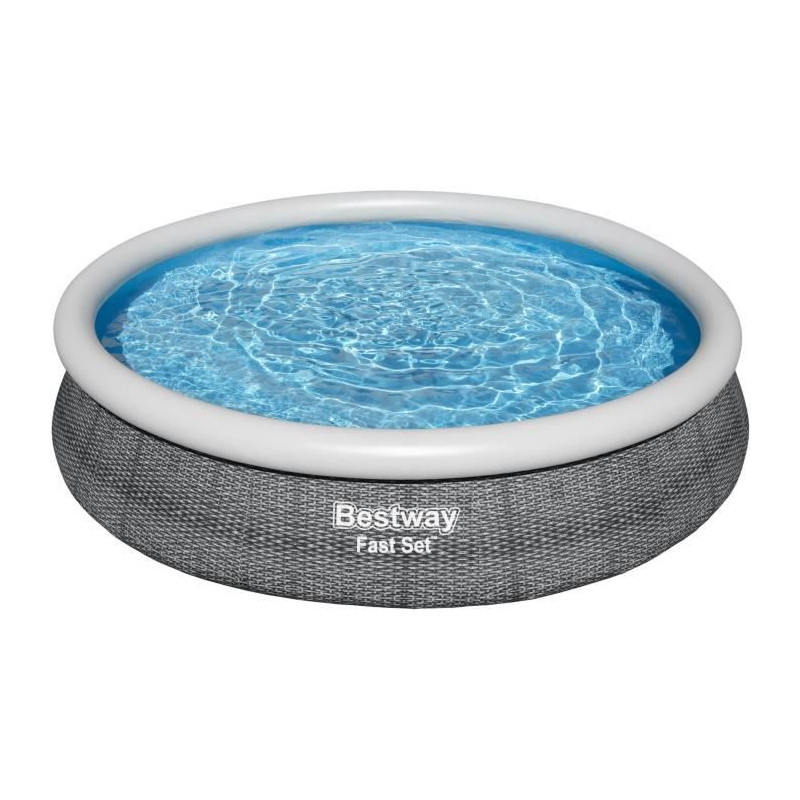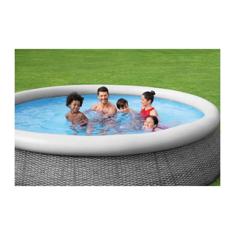 Piscine hors sol Fast Set(TM) ronde effet rotin : - 366 x 76 cm avec anneau supérieur gonflable - Motif rotin gris - Volume d'eau a 80% : 1249 L - Liner en Duraplus(TM) matériau ultra résistant - Valve de vidange intégrée permettant le raccord au tuyau d'arrosage (adaptateurs inclus) - Montage facile sans outil - Facile a démonter et a stocker pour l'hivernage Contient une pompe et une cartouche de filtration typ