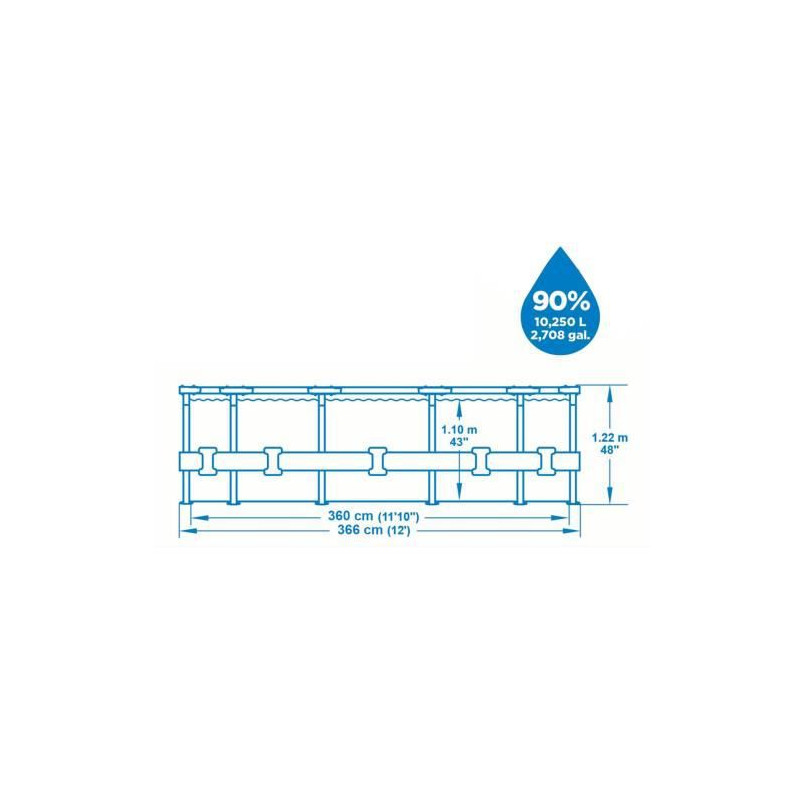 Piscine hors-sol conçue pour que les enfants de la maison puissent s'amuser en faisant de l'exercice. Vous pouvez l'installer rapidement et sans difficulté. Ce modele de 366 x 122cm comprend un épurateur a cartouche de 2.006 litres/h, une échelle, une bâche et peut etre vidé rapidement. Il a une capacité de 10.250 litres.