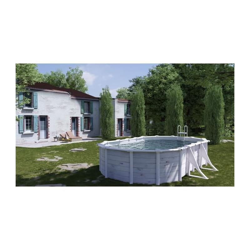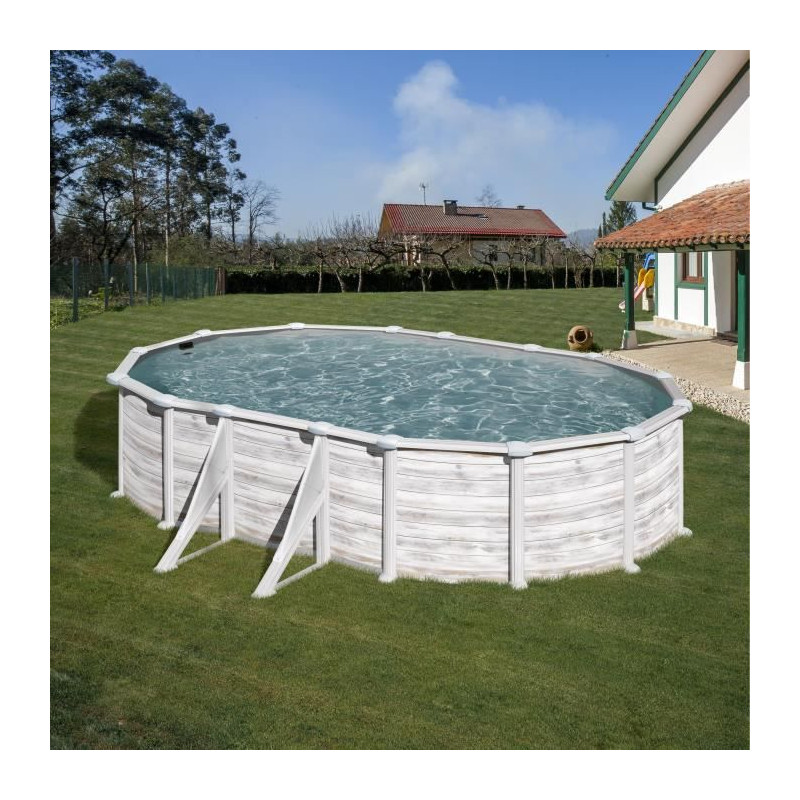 Dimensions intérieures: 5,00m x 3,00m x H:1,30m Dimensions extérieures: 5,27m x 3,27m x H: 1,32m Renforts apparents Structure acier imitation bois 45/100º Filtration a sable 6m³/h, sable fournit Volume 14,50m³ Liner gris 40/100e Echelle de sécurité plateforme + 2x3 marches Tapis de sol en polyéthylene Garantie 4 ans sur la structure / 2 ans sur la filtration et les accessoires